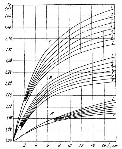 Здесь Vl = Vlz × Kz. Kl - коэффициент приведения скорости ветра, измеренной над сушей, к условиям водной поверхности. Значения коэффициента Kl (рис. 2) определяют для разгонов ветра над водной поверхностью L < 20 км. Тип местности А, В, С принимают согласно СНиП 2.6-74 «Нормы проектирования. Нагрузки и воздействия»1. 1 А - открытые местности (степи, лесостепи, пустыни, открытые побережья морей, озер, водохранилищ); В - территории малых и средних городов, территории больших и крупных городов, застроенных зданиями высотой до 20 м; С - территории больших, крупных и крупнейших городов, застроенных зданиями свыше 20 м. Пример определения расчетной скорости ветра дан в справочном приложении 2 настоящих Норм. Рис. 2. Определение коэффициента Kl при скорости ветра V, м/с 1 - 10; 2 - 15; 3 - 20; 4 - 25; 5 - 30; 6 - 35; 7 - 40; А, В, С - тип местности 2.9. При отсутствии данных наблюдений за ветром в радиусе 200 км от проектируемого объекта необходимо определять ветер по картам атмосферного давления в приземном слое (синоптическим картам)1. 1 Карты можно получить в синоптическом архиве ЦГМО г. Обнинска. 2.10 Длину разгона волн и глубины вдоль луча волны определяют по румбам от точки проектируемого сооружения, на которую воздействуют ветровые волны, до уреза свободной водной поверхности (берег, искусственное сооружение и т.п.). Исходные данные определяют по картам масштабом не менее 1:25000 или натурной съемкой. 3. РАСЧЕТ ПАРАМЕТРОВ ВЕТРОВЫХ ВОЛН3.1. Согласно СНиП 2.06.04-82* водоем делится на следующие зоны: глубоководная,