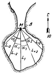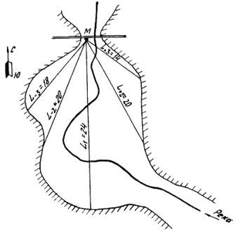 Lp / Lp = 0,27 [24 + 0,85 (20 + 20) + 0,5 (18 + 14)] = 20. Лучи проводятся из расчетной точки до пересечения с линией берега в направлении θ = ±22,5n, град, от главного луча (луча в направлении румба, ветер которого принимается в расчет), n принимает значения 1; ±2; ±3. Мостовой переход автомобильной дороги строится в узком месте поймы реки. При паводке 1 %-ной обеспеченности ширина узкой части поймы по уровню воды B = 5 км. Необходимо определить элементы ветровых волн, воздействующих на насыпь мостового перехода в точке М. Глубина воды d = 20 м. Из точки М проводим лучи (рисунок) до пересечения с границей затопления поймы. Главный луч проводим по направлению расчетного ветра (Ю), скорость ветра (4 %-ной обеспеченности) в этом направлении Vw = 10 м/с. Эквивалентный разгон Lp = 20 км. Определяем