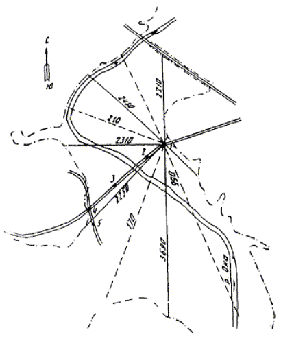 Автодорожный мостовой переход через р. Оку: -×-×- - граница разлива при паводке 1 %-ной обеспеченности; ___ - лучи по румбам, главные; ------ - лучи по дополнительным спектральным составляющим; 1 - 5 - точки Автодорога II категории. Расчетная обеспеченность уровня, на котором определяют ветровые волны - 1 %. Откосы насыпи (m = 2) в пойме р. Оки предполагается крепить камнем или железобетонными плитами, по п. 1.15 расчетный шторм принимается 4 %-ной обеспеченности. Пойма р. Оки в районе мостового перехода представляет собой плоскую низменность, на большей части имеющую очень небольшие колебания отметок. Ширина поймы у перехода 2 км, коренные берега обрывистые. При расчетном уровне 1 %-ной обеспеченности средняя глубина на пойме d = 3,8 м. В основной своей части трасса мостового перехода прямолинейна. Для расчета волнения разбиваем трассу мостового перехода на 4 участка. Точки 1 и 5 расположены соответственно в начале и конце трассы; 4 - в месте пересечении дорог; 2 и 3 - промежуточные на прямолинейном отрезке трассы, расстояние между ними примерно 1000 м. Скорости ветра Vw 4 %-ной обеспеченности, полученные по методике, изложенной в справочном приложении 2, и длины разгонов по 8 румбам для точки 1 даны в табл. 1. Таблица 1