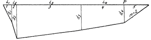 Профиль дна мелководного водоема: 1 - 5 - участки; L1 - L4 - соответственно 8000, 2000, 22000, 20000 м; d1 - d4 - соответственно 8, 20, 15, 10 м Профиль разбивается на участки так, чтобы в пределах каждого участка уклон дна был примерно постоянным. Длина участка не должна быть меньше 1 км. Средние