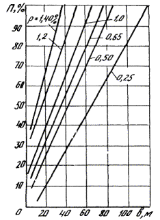 Определение коэффициента гашения высоты волны П, %, в зависимости от ширины полосы кустарника b, м и процента густоты зарослей р, % 2. Ширину полосы кустарника определяют в направлении волноопасных румбов по карте района строительства, составленной изыскательской партией. 3. Процент густоты зарослей находят по таблице, приведенной в настоящем приложении, в зависимости от диаметра основных стволов1 и количества их на 1 м2 площади зарослей. 1 Под диаметром основного ствола подразумевается толщина ствола ниже первых веток. Эти данные для расчета необходимо получить в процессе изысканий под строительство объекта. 4. При наличии в кустарнике прогалин процент густоты зарослей уменьшается пропорционально площади прогалин. 5. На процент гашения высоты волны П, %, уменьшается расчетная высота волны (в системе волн расчетного шторма), образовавшейся перед зарослями: hпi = hi (100 - П) : 100. Пример. В процессе изысканий и предварительного проектирования выяснилось, что пойма реки в волноопасном направлении частично заросла мелколесьем. Заросли высотой 2 - 2,5 м, не сплошные, с площадью прогалин, которая составляет 28 % от общей площади зарослей поймы. В процессе отсыпки пойменной насыпи предполагается, что кустарник будет уничтожен на расстоянии 50 м от основания насыпи и оставшаяся полоса кустарника будет иметь ширину от 60 до 100 м. Глубина затопленной поймы при уровне 0,33 %-ной обеспеченности d = 1,5 м, расчетная высоты волны 1 %-ной обеспеченности в системе волн шторма 50 %-ной обеспеченности на подходе к полосе мелколесья h1% = 0,5 м. В этом случае эффективная высота кустарника d + 0,7hi будет 1,5 + 0,5 × 0,7 = 1,85 м, что меньше высоты кустарника на пойме (2 м). Эффект гашения волны в кустарнике будет достигнут. По данным изысканий на каждый 1 м2 зарослей части поймы в среднем приходится 7 - 8 стволов со средним диаметром d = 2,5 см. По таблице процент густоты кустарника p = 0,344, с учетом прогалин Рg = 0,344 × (100 - 28) : 100 = 0,25. При ширине полосы кустарника b = 60 м по графику получим процент гашения высоты волны П = 47 %. Расчетная высота волны 1 %-ной обеспеченности после