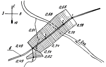 Эпюра значений h5%: 1 - 5 - точки; 6 - трасса мостового перехода На этом объекте для расчетных направлений рефракцию волн не рассчитывали, так как углы между нормалью к трассе и направлением расчетного волнения были меньше 40° и соответственно коэффициенты рефракции при m = 2 не могут быть меньше 0,9 (фактически они были больше 0,94) и в расчет могут не приниматься. Однако бывают случаи, когда необходимо учитывать и те направления, по которым волны подходят к откосу с очень большими углами (относительно нормали). Большие разгоны и скорости ветра по этим направлениям позволяют развиваться большим волнам, которые даже после рефракции сохраняют на линии обрушения достаточную величину. В качестве примера ниже приводится расчет высоты волны с учетом рефракции волн по двум направлениям на участке 3 одного из мостовых переходов через реку. Участок № 3 расположен от ПК 183 до ПК 222 и имеет азимут 63°. С низовой стороны участка 3 разгоны ограничиваются постройками двух небольших поселков, расположенных менее чем в 1 км от трассы. С низовой части участка 3 для его начала (от ПК 183 до ПК 212) расчетным является направление В, а конец участка рассчитывают по направлению ЮЗ. В табл. 3 собраны исходные величины для расчета параметров волнения. Заложение откоса насыпи ctg φ = 2,5. Как видно из табл. 3, на расчетных участках углы a > 40°. В этом случае расчет рефракции необходим. В табл. 4 даны последовательные этапы расчета и полученные величины расчетных параметров волнения для низовой стороны участка 3 с учетом рефракции волн. Коэффициент рефракции Kr рассчитан по формулам (5) и (6) настоящих Норм. Несмотря на сравнительно небольшие значения расчетных (1 %-ной обеспеченности в системе) высот волн, они являются наибольшими на данных пикетах участка 3. Таблица 3