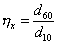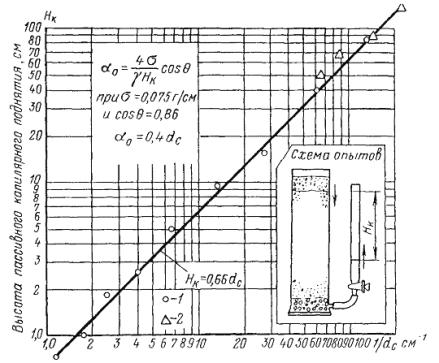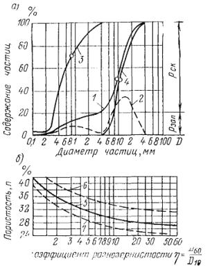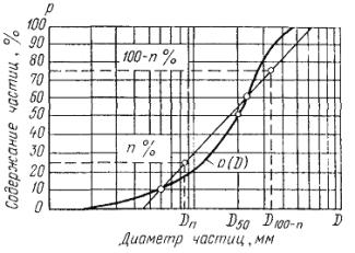 Рис. 1. Вспомогательное графическое построение для определения расчетного диаметра пор зернистого материала d0 Примечание. Следует иметь в виду, что в очень разнозернистом (hx > 25) грунте мелкие фракции могут распределяться неравномерно в порах крупных фракций (скелета), в связи с чем грунт становится неоднородным по своей структуре и оценка поперечника его поровых каналов по формулам (2.2) и (2.3) часто приводит к большим ошибкам. В этом случае предпочтительнее воспользоваться формулой (2.4). Зная d0 зернистого несвязного грунта, нетрудно вычислить его коэффициент ламинарной фильтрации: и турбулентной фильтрации: где b = 2.5. Критическая скорость, соответствующая началу отклонения от линейной фильтрации (закона Дарси): Соответственно критический градиент напора