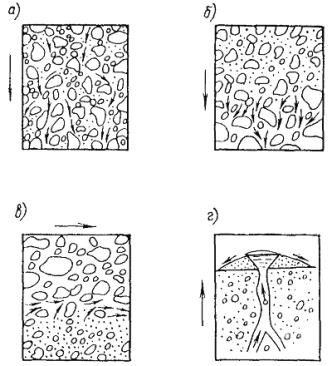 3.34. Разновидностью контактной суффозии также является перемещение под действием поперечного фильтрационного потока частиц несвязного грунта в поры более крупного зернистого материала (например, в поры обратного фильтра) или, что то же самое, перемещение частиц в поровом пространстве неоднородного по зерновому составу грунта (рис. 8, б).