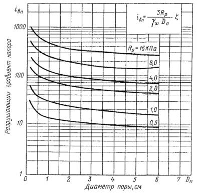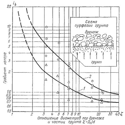 Данная разновидность суффозии по своей физической сущности будет принципиально отличаться от контактного выпора связного грунта и поэтому разрушающие (критические) значения выходных градиентов напора будут иными. Они намного меньше разрушающих градиентов для связных грунтов.