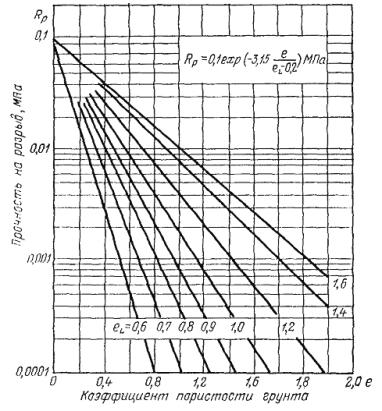 Для облегчения расчетов на рис. 12 приведены графики изменения долговременной прочности в зависимости от е и eL конкретного грунта. Как видно, малопластичные супесчаные грунты с eL £ 0,75 более чувствительны к изменению плотности и значительно быстрее набирают прочность при уплотнении, чем суглинки и глины.