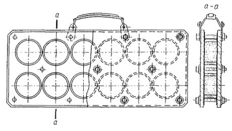 В связи с этим предлагается специальный контейнер для хранения и транспортировки образцов грунта, отобранных с помощью колец, без парафинирования. Контейнер, конструкция которого поясняется чертежом на рис. 15, представляет собой две пластины, изготовленные из толстой фанеры или текстолита, соединенные болтами. Между этими пластинами помещают кольца с грунтом. Для обеспечения полной герметизации колец на внутренней поверхности пластин укрепляется резиновая или полиэтиленовая прокладка. После того, как кольца с грунтом уложены в контейнер, гайки на болтах закручиваются и, таким образом, кольца оказываются плотно прижатыми к прокладкам. Практически удобнее всего помещать в контейнер от 8 до 12 колец. Для переноски контейнера к нему прикрепляется ручка.