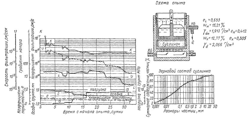 Рис. 30. Схема и результаты испытаний грунта на контактный размыв в вертикальном фильтрационно-суффозионном приборе