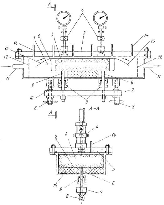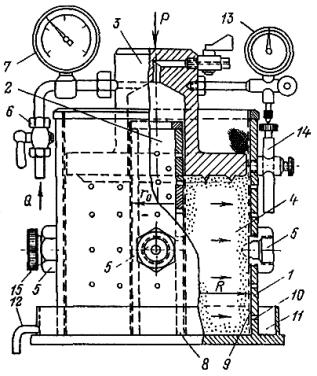 Наиболее распространенным в настоящее время вертикальным фильтрационно-суффозионным прибором, предназначенным для испытаний на водопроницаемость и фильтрационную прочность зернистых грунтов с нарушенной структурой, является прибор (рис. 13), включающий следующие основные элементы: 1 - рабочую камеру цилиндрической формы, выполненную из прозрачного материала, например, оргстекла; 2 - неподвижную опорную решетку, расположенную в нижней части рабочей камеры; 3 - конический отстойник; 4 - присоединенный к отстойнику пескосборник, в котором собираются вымываемые из грунта частицы; 5 - патрубок для выпуска профильтровавшейся через грунт воды (при нисходящей фильтрации) или для ее впуска (при восходящей фильтрации); 6 - приспособление для поддержания на постоянной отметке уровня вытекающей из прибора воды; 7 - подвижная решетка, посредством которой равномерно распределяется по площади образца внешняя нагрузка; 8 - шток, передающий нагрузку от силового домкрата; 9 - устройство для измерения деформаций сжатия образца грунта; 10 - приспособление (вантуз) для выпуска воздуха из верхнего отсека рабочей камеры; 11 - крышку рабочей камеры; 12 - приспособление для создания и измерения напора воды, подаваемой в рабочую камеру; 13 - тройниковые краники для регулирования поступления воды в пьезометры и выпуска из них воздуха; 14 - трубчатые пьезометры.