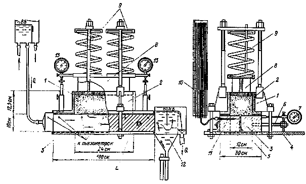 Водопроницаемость несвязного грунта также можно определить, испытывая его в горизонтальном лотке (рис. 14), с помощью которого создают условия напорной или безнапорной фильтрации воды в грунте. В первом случае лоток должен иметь приспособление в виде поршня, установленного в верхней части рабочей камеры и обеспечивающего ее герметизацию. Это вызывает существенное усложнение конструкции лотка. Но сама методика испытаний грунта в напорном лотке практически ничем не отличается от методики экспериментов по определению проницаемости грунтов с помощью вертикального фильтрационно-суффозионного прибора.