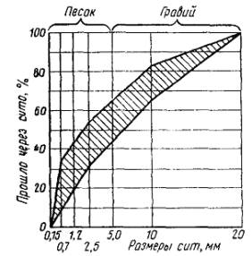 ПРИЛОЖЕНИЕ 2МЕТОДИКА ОПРЕДЕЛЕНИЯ ОПТИМАЛЬНОГО КОЛИЧЕСТВА ДОБАВКИ-УСКОРИТЕЛЯ СХВАТЫВАНИЯОпределение сроков схватывания растворов с добавкой производится на приборе Вика. Навеска цемента принимается равной 100 г. Цемент тщательно перемешивается с порошкообразной добавкой, количество которой принимается в начале опыта минимальным. В смесь заливается вода в количестве, соответствующем нормальной густоте данного цемента. Примечание. а) Нормальная густота цемента определяется по стандартной методике; б) при применении жидкой добавки-ускорителя схватывания она вводится в смесь вместе с водой. Количество растворенной добавки применяется в начале опыта минимальным. Минимальное количество добавки-ускорителя схватывания в начале опыта принимается равным 2 % от массы цемента. После затворения смесь быстро перемешивается и укладывается в кольцо прибора Вика. Игла доводится до соприкосновения с поверхностью теста, после чего стержень иглы массой 100 г освобождается и игла свободно погружается. За начало схватывания принимается время от начала затворения до того момента, когда игла не доходит до дна на 1 мм. За конец схватывания принимается время, прошедшее от начала затворения до момента, когда игла проникает в раствор не более 1 мм. Оптимальное количество добавки должно соответствовать времени окончания схватывания не более 3 мин. После определения оптимального количества добавки производится проверка прочности цементного раствора. Прочность определяется на образцах-кубиках размером 3´3´3 см, приготовленных из цементного раствора состава 1:3 (цемент : песок) по массе. Ввиду того что цементно-песчаный раствор с добавкой быстро схватывается, образцы должны приготовляться из небольших порций смеси. Навески: цемент - 50 г, песок - 150 г и добавка перемешиваются в металлической или фарфоровой чашке. Затем в смесь вводится вода в количестве 20 - 25 см3, что соответствует водоцементному отношению 0,4 - 0,5. Примечание. При применении жидкой добавки она вводится в сухую смесь вместе с водой для затворения. После перемешивания раствор быстро (до начала схватывания) укладывается в формы. Через час после укладки раствора в форму образцы распалубливаются. Количество образцов назначается из расчета пяти серий испытаний в возрасте: 3 ч, 1, 3, 7 и 28 суток. Одновременно изготавливаются и испытываются контрольные образцы из цементно-песчаного раствора аналогичного состава без добавки. Прочность образцов с добавкой в возрасте 1, 3, 7 и 28 суток не должна быть ниже прочности контрольных образцов того же состава. ПРИЛОЖЕНИЕ 3ПОДБОР СОСТАВА СУХОЙ СМЕСИ НАБРЫЗГБЕТОНА(пример расчета) Требуется подобрать состав сухой смеси для набрызгбетона марки 300. Гранулометрический состав гравия и песка приведен в табл. 1 и 2. Таблица 1