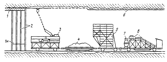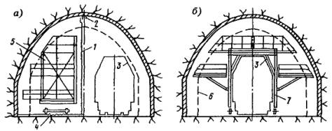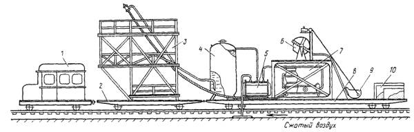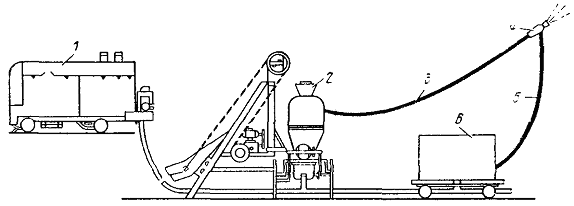 4.3. Набрызгбетон обладает высокой устойчивостью к воздействию агрессивных вод. Коэффициент шероховатости покрытий из набрызгбетона составляет 0,024 - 0,027. При нанесении последнего слоя без крупного заполнителя и при заглаживании и железнении эту величину можно снизить до 0,018 - 0,015. 4.4. За марку набрызгбетона принимается предел прочности на сжатие специально изготовленных бетонных образцов размером 10´10´10 или 10´10´40 см из рабочего состава набрызгбетонной смеси. Предел прочности образцов определяется согласно стандартной методике в соответствии с требованиями ГОСТ 18105-72. «Бетоны. Контроль и оценка однородности и прочности». 5. ОБОРУДОВАНИЕ, ПРИСПОСОБЛЕНИЯ И ИНСТРУМЕНТЫ5.1. В состав оборудования и механизмов по нанесению набрызгбетона входят: механизмы для перегрузки сухой смеси с транспортных средств в машины для нанесения набрызгбетона или составляющих сухой смеси в смесительное оборудование; сортировочное оборудование (грохоты, сита); дозирующие устройства; смесительное оборудование, обеспечивающее приготовление и тщательное перемешивание смеси; машина для нанесения набрызгбетона; резервуар с водой, обеспечивающий подачу ее к соплу под давлением; компрессор для снабжения сжатым воздухом набрызгбетономашины; устройства и приспособления для управления движением сопла в процессе набрызга бетонной смеси. Оборудование комплектуется в зависимости от конкретных условий производства работ. Краткая характеристика оборудования дана в приложении 5. 5.2. Подготовка поверхности к набрызгу бетонной смеси при большом объеме работ производится песком под давлением с помощью набрызгбетономашины с заменой втулки сопла втулкой меньшего диаметра. При малом объеме работ для подготовки поверхности к набрызгу бетонной смеси необходимо иметь: молотки, зубила, металлические щетки, скребки, ведра. 6. ТЕХНОЛОГИЯ НАНЕСЕНИЯ НАБРЫЗГБЕТОНАА. Подготовка поверхности 6.1. Поверхность перед набрызгом бетонной смеси должна быть очищена от грязи, пыли, краски, сажи и масляных пятен. Отслаивающиеся куски породы или старой обделки удаляются оборником (буровая штанга или металлический стержень длиной порядка 2 м с заостренным концом) или отбойным молотком. 6.2. Перед омоноличиванием стыков, заделкой дефектных мест и усилением бетонных конструкций необходимо произвести обработку бетонируемой поверхности: разделку бетонируемых полостей, удаление наплывов и некачественного бетона; снятие оставшейся опалубки; при необходимости дренирование фильтрующей воды, механическую обработку сопрягаемых поверхностей (насечку). 6.3. Обработанная поверхность перед нанесением бетонной смеси должна быть продута сжатым воздухом и промыта напорной струей воды. Продувка и промывка поверхности выполняются непосредственно перед набрызгом бетонной смеси при помощи сопла набрызгбетономашины при давлении в шланге 2 - 3 кгс/см2. 6.4. Нанесение набрызгбетона на неувлажненную поверхность не допускается, так как происходит отсасывание воды из свежеуложенного материала, что резко снижает прочность набрызгбетона. Подготовленная поверхность должна быть предохранена от повторного загрязнения. 6.5. При нанесении набрызгбетона на слабые размокаемые горные породы (поверхности тоннельных выработок, откосы припортальных выемок, водопропускные сооружения) предварительно прои
