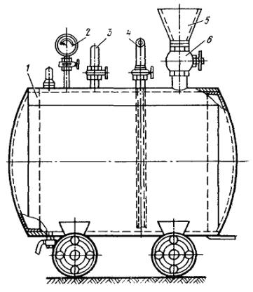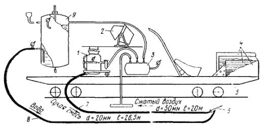 Резервуар для воды (рис. 5) представляет собой бак 1, установленный на тележке. В верхней его части укреплена воронка 5 с краном 6, через которую бак наполняют водой. Рядом с воронкой установлены штуцер 4, к которому присоединен водяной резиновый шланг, идущий к соплу набрызгбетономашины, и штуцер 3, к которому присоединен трубопровод для сжатого воздуха от компрессора. Водяной бак снабжен манометром 2. Объем резервуара должен обеспечивать непрерывность работы в течение возможно большего времени. С целью полного исключения перерывов при укладке бетонной смеси следует применять параллельное включение двух напорных емкостей, из которых одна находится в работе, а вторая в это время может быть под заливкой. Оборудование для приготовления сухой смеси для набрызгбетона. Для просеивания материалов должны быть использованы грохоты или другое стандартное оборудование. При малых объемах работ возможно просеивать материалы вручную через проволочные сита. Для дозирования инертных при приготовлении сухой смеси непосредственно под расходными бункерами целесообразно располагать блок дозаторов. Емкость каждого дозатора в блоке назначается в соответствии с объемом или массой компонента, необходимого для одного замеса в смесителе. Следует предусматривать возможность изменения емкости дозаторов на случай изменения соотношения между составляющими в смеси. Рис. 5. Резервуар для воды Таблица 3