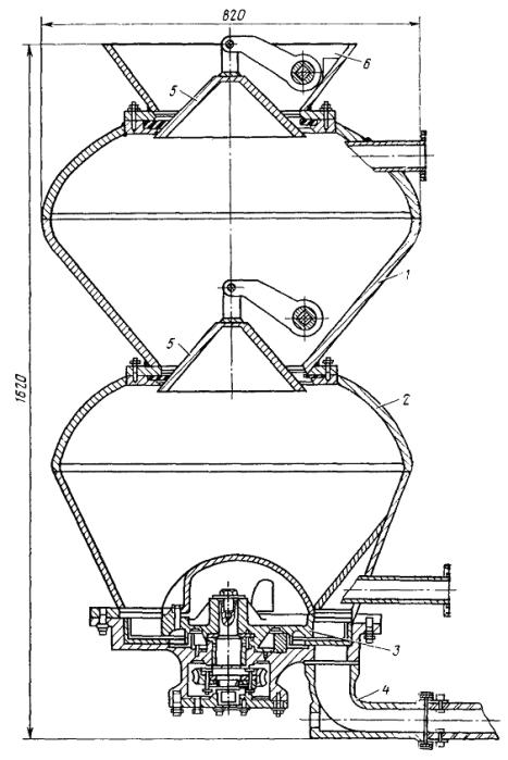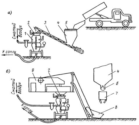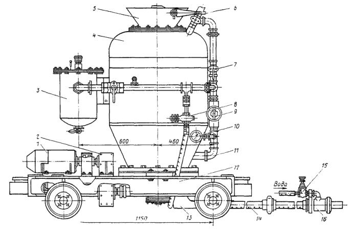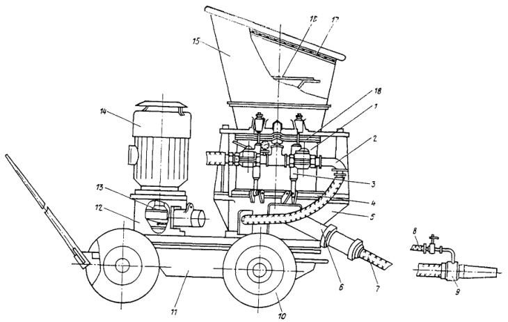 *Указаны размеры варианта исполнения на салазках. Машина СБ-67 (С-1007) (рис. 1) монтируется на платформе 12, снабженной четырьмя колесами. В верхней части рабочей камеры (бункера) 4 находится загрузочная воронка 5 с колоколообразным клапаном. Рычаг управления клапаном (рукоятка 6) крепится на воронке. В нижней части рабочей камеры находится дозирующее устройство, которое приводится в действие с помощью электродвигателя 1 через редуктор 2. Материальный рукав 14 одним концом присоединяется к патрубку 13, на другой конец рукава навинчивается сопло 16. Сжатый воздух подается в камеру через фильтр 3. Пневмосистема машины оборудована манометром 10. Машина БМ-68У (рис. 2) включает в себя дозатор, состоящий из вращающегося барабана 1, неподвижных верхнего и нижнего уплотнительных дисков 18 и 4. Нижний диск снабжен одним разгрузочным окном и прикреплен к основанию дозатора 5, к которому в свою очередь закрепляется выходной патрубок 6. Верхний диск снабжен одним продолговатым загрузочным проемом и системой отверстий. Диск закрепляется к крышке дозатора винтами 3. С помощью установочных вилок крышка дозатора фиксируется в неподвижном положении на кронштейнах основания дозатора. С помощью четырех стяжных винтов 3 крышка дозатора прижимается вниз, благодаря чему создается надежное уплотнение между торцами барабана и уплотнительными дисками. На крышке дозатора установлена загрузочная воронка 15 с ситом 17. Внутри воронки вращается побудитель 16, прикрепленный к барабану. По ходу вращения барабана в уплотнительных дисках, а также в основании и крышке дозатора выполнены отверстия для стравливания в атмосферу сжатого воздуха из опорожненных ячеек барабана. К соответствующему отверстию основания дозатора закреплен лоток для отвода за пределы машины частиц материала, случайно оставшихся в ячейках барабана. Сжатый воздух от магистрали подводится к выходному штуцеру пневмосистемы 2 и затем разводится через крышку дозатора к продувочным щелям для продувки и разгрузки ячеек барабана и с помощью гибкого шланга к тыльной стороне выходного патрубка для направления сухой бетонной смеси в материальный шланг 7. На конце материального шланга установлено сопло 9, в котором происходит затворение сухой смеси водой, подаваемой через водяной шланг 8. Основание дозатора прикрепляется к верхней крышке трехступенчатого цилиндрического редуктора 11, на выходном валу которого установлен барабан дозатора. Корпус редуктора служит одновременно несущей рамой для всей машины. Привод осуществляется от двухскоростного электродвигателя 14 типа АО2-52-8/4 через дисковую муфту включения 13, установленную на входном валу редуктора. Электродвигатель прикрепляется своим фланцем к основанию двигателя 12, которое в свою очередь прикрепляется к крышке редуктора. По договоренности с заказчиком машина может быть выполнена в варианте на салазках или на колесах 10. Машина С-630А (рис. 3) имеет шлюзовую 1 и рабочую 2 камеры, которые закрываются конусными клапанами 5. Сухую смесь вначале загружают в шлюзовую камеру, после чего верхний клапан закрывается и в камеру подается сжатый воздух. Когда давление в шлюзовой и рабочей камерах выравнивается, нижний корпусный клапан падает под действием собственного веса, и смесь пересыпается в рабочую камеру. В ее нижней части вращается тарельчатый дозат