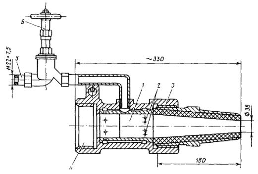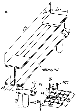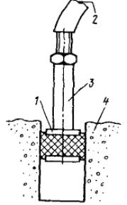 Примечание. Журнал заполняется мастером ежесменно. Не реже двух раз в неделю записи в журнале проверяются начальником участка (прорабом) и лаборантом. ПРИЛОЖЕНИЕ 7МЕТОДИКА ИЗГОТОВЛЕНИЯ И ИСПЫТАНИЯ ОБРАЗЦОВ ИЗ НАБРЫЗГБЕТОНАОбразцы из набрызгбетона получаются из специально приготовленных плит большого размера. Плиты приготавливаются в деревянных ящиках размером 50´50´12 см. Крайние части плиты с нарушенной структурой опиливаются, а из средней можно выпилить 9 кубиков размером 10´10´10 см, которые используются для испытания на сжатие, осевое растяжение и морозостойкость. Испытания проводятся в соответствии с ГОСТ 4800-59 «Бетон гидротехнический. Методы испытаний бетона». Возможно также получение образцов (для испытания на прочность) из набрызгбетона в виде кернов диаметром, равным 7,5 - 13,5 см. Для их выбуривания можно использовать любой станок вращательного бурения с кольцевой коронкой. Прочность набрызгбетона данного состава может быть определена путем испытания образцов-кубов с размером ребра 15 см (ГОСТ 10180-74), изготовленных в металлических формах с вибрационным уплотнением. В этом случае прочность вибрированных образцов, с учетом поправочного коэффициента К = 0,9, может быть принята равной прочности набрызгбетона данного состава в конструкции. Для испытания на водонепроницаемость применяются керны из набрызгбетона d = 15 см и длиной 15 см. Возможно проведение испытаний по упрощенной методике с изготовлением образцов из набрызгбетона в виде плит размером 70´40´18 см с тремя цилиндрическими полостями d = 3,6 см (рис. 1). Образец изготавливается в деревянной форме, к днищу которой прикреплены три металлических вкладыша, которые и образуют полости. Рис. 1 Образец для испытания набрызгбетона на водонепроницаемость Рис. 2. Закрепление штуцера в образец для испытаний его на водонепроницаемость: 1 - резиновая прокладка; 2 - подача воды; 3 - штуцер; 4 - образец Рис. 3. Приспособление для определения сцепления набрызгбетона: а - опорное приспособление; б - рамка Для испытания в полости подается вода через специальные штуцера (рис. 2). Режим испытания устанавливается в соответствии с ГОСТ 4800-59. Для определения качества получаемого материала в процессе производства работ рекомендуется определять сцепление набрызгбетона с породой путем отрыва образцов при помощи сетчатой рамки или прибора конструкции ЛИИЖТа, а в слабых породах - прибора НИИСПа Госстроя УССР. Для определения сцепления набрызгбетона со скальной породой в натурных условиях разработаны различные приспособления, одно из которых показано на рис. 3. Образцы изготовляют следующим образом. На выбранный относительно ровный участок поверхности выработки наносят слой набрызгбетона толщиной 2 - 3 см. В этот слой втапливают сетчатую рамку. Затем наносят слой набрызгбетона толщиной 8 - 10 см. Через 1,0 - 1,5 ч после этого оконтуривают образец при помощи ручного зубила. Применять для этой цели механизированный инструмент не рекомендуется, так как можно повредить образец. Отрывая образцы домкратом с использованием опорного приспособления можно определить величину сцепления с учетом особенностей данной поверхности (шероховатости, микротрещиноватости и т.п.). Для более объективной оценки величины сцепления можно произвести серию контрольных покрытий набрызгбетоном не на поверхности выработки, а на с