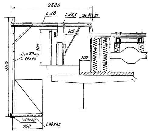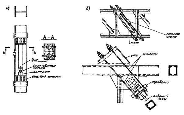 где l1; l2 - база измерения (до и после натяжения стержня); Pq; wбр; Е - усилие, приходящееся на один тяж, площадь стержня (брутто) и модуль упругости стали. 4.3.21. Для выключения из работы одного элемента, имеющего усилие более 10-12 т, рекомендуют использовать арматурные пучки и домкраты двойного действия для натяжения пучков арматуры. В этом случае арматурные пучки, расположенные симметрично по одному с каждой стороны элемента (относительно плоскости фермы), должны полностью принять усилие от ремонтируемого элемента. С одного конца пучок крепят к жесткому упору на поясе фермы, а с другого - к тяжам, которые обеспечивают регулирование положения пучка. Усилие от пучка к тяжам передается через траверсу (рис. 13б). Натяжение пучков производят домкратами, закрепляемыми в месте расположения тяжей (между ними). Положение пучков фиксируют гайками на концах тяжей, служащими упором. Размеры пучка, тяжей и траверс, а также грузоподъемность и тип домкрата подбирают в зависимости от конкретных условий - величины усилий в элементе и его положения в конструкциях. 4.3.22. Для выключения из работы отдельных сжатых элементов с небольшими усилиями (от собственного веса пролетных строений) можно использовать распорные брусья (деревянные или металлические сварные) в сочетании с домкратами. В этом случае должны быть разработаны специальные упоры, которые устанавливают и закрепляют на элементе. В период замены поврежденного элемента усилие будет передаваться через распорные брусья и упоры на другие элементы конструкции. Домкратов должно быть не менее двух, расположенных симметрично относительно оси элемента и плоскости фермы (или балки). 4.3.23. При замене большого числа элементов, восстановлении деталей поясов балок и ферм, узлов, а также элементов решетки при усилиях в поврежденном элементе более 16-20 т, ремонт конструкций рекомендуют проводить со оплошных подмостей, устраиваемых на временных опорах под пролетным строением. Разгрузку конструкций пролетных строений от собственного веса производят путем их поддомкрачивания с подмостей. Порядок и последовательность работ проводят в соответствии с проектом ремонта конструкций. 4.3.24. Для ремонта стальных элементов и конструкций следует применять стали, используемые при строительстве мостов. В пролетных строениях, выполненных из углеродистой стали, разрешают использовать сталь марки 16Д (бывшую М16С) по ГОСТу 6713-75. На старых пролетных строениях (постройки 30-40х годов и ранее) допускается применять сталь марки БСт3сп5 по ГОСТу 380-71 для ремонта элементов. Эту сталь следует также использовать для восстановления различных эксплуатационных обустройств (смотровых приспособлений, перил, ограждающих устройств, элементов тротуаров). 4.3.25. Пролетные строения, выполненные из низколегированной стали, ремонтируют, как правило, металлом из сталей марки 15ХСНД или 10ХСНД по ГОСТу 6713-75; разрешается применять низколегированные стали 14Г2АФД по ГОСТу 1982-73. При их отсутствии для усиления элементов, выполненных из высокопрочной стали, путем добавления металла, можно использовать углеродистую сталь марки 16Д. 4.3.26. Для мостов северного исполнения необходимо применять стали, которые удовлетворяют требованиям хладостойкости. Это стали марки 15ХСНД-2 и 15ХСНД-3 по ГОСТу 6713-75, рекомендуемые для зоны исполнения А (расчетная минимальная тем