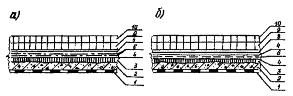 В качестве армирующего материала применяют армирующие сетки Э3-200 по ГОСТу 19907-74, ткань льно-джутокенафную упаковочную № 2, 3 и технического назначения № I и 2 по ГОСТу 5520-71. 3.5.9. Применяют также гидроизоляцию из полиэтиленовой пленки (толщина ее - не менее 0,15 мм) эластичной в интервале температур до -60°С стабилизированной сажей, сохраняющей свои свойства во времени. Пленка должна соответствовать требованиям ГОСТа 10354-73. Конструкция такой изоляции состоит из подстилающего слоя гидроизола или пергамина и двух слоев полиэтиленовой пленки, которые покрывают сверху пергамином по ГОСТу 2697-75 или гидроизолом по ГОСТу 7415-74. Работы по укладке, стыковке и сварке гидроизоляции выполняют специализированные бригады. В случае повреждения пленки накладывают заплату, которая промазывается мастикой КН-2 по ТУ 38-00-506-72 слоем толщиной 1-1,5 мм по периметру на расстоянии 10-15 см от дефектного места. 3.5.10. Для суровых климатических условий рекомендуют применять тиоколовую мастичную гидроизоляцию (ТМ). Мастики могут быть двухкомпонентными марки СМ-I по ТУ 3833-119-69 или трехкомпонентными марки У-30М по ГОСТу 13489-79. 3.5.11. В случае применения для ремонта изоляции из битумных лаков, разжиженного битума или горячих резино-битумных мастик, армированных рулонным материалом (гидроизолом, стеклотканями), по подготовленной поверхности бетона наносят грунтовочный слой кистью с длинной рукояткой или краскораспылителем. После просыхания грунтовочного слоя всю поверхность покрывают битумной мастикой (или резинобитумной) при температуре +160-180°С слоем 2 мм и накладывают листы из рулонного материала с перекрытием полотен не менее 10-15 см. Если ремонт проводят на части мостового полотна, то новая изоляция должна перекрывать неповрежденный участок изоляции не менее, чем на 40 см. При многослойной гидроизоляции повторяют слой мастики и рулонный материал. На последний слой по рулонному материалу наносят также слой мастики толщиной 2 мм. Рулонный материал расстилают на поверхности и разглаживают ручным катком, начиная от середины (по ширине) полотна. Эти работы рекомендуют проводить в сухую погоду при температуре от +15 до +25°С; ниже +5°С устраивать гидроизоляцию из этих материалов не следует. Работы по устройству изоляции начинают от тротуарных блоков к середине проезжей части. Рулонные материалы расстилают вдоль пролетного строения. Крайнее полотно укладывают так, чтобы оно находило на вертикальную поверхность тротуарного блока на 12 см. Изоляция приклеивается к вертикальной поверхности мастикой или синтетическими клеями. 3.5.12. При устройстве гидроизоляции около водоотводных трубок выполняют следующие операции: очищают трубки от грязи и мусора, устраняют повреждения бетона вокруг нее, металл трубки очищают от ржавчины и окрашивают битумным лаком, при необходимости заменяют их, выполняют сопряжение изоляции с трубками. Сопряжение гидроизоляции с водоотводными трубками должно быть выполнено с применением резиноподобных манжетных элементов заводского изготовления. Можно сопрягать гидроизоляцию с трубками послойным наклеиванием вокруг их раструба косынок, вырезанных из армирующего материала (стеклянного, льно-джутокенафного), и с заведением в раструб лепестков. При любых типах гидроизоляции с применением армирующей ткани у водоотводных трубок укладывают два дополн