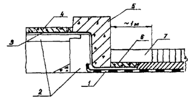 - с использованием фольгоизола; б - гидростеклоизола и армогидробутила; 3.5.19. Для улучшения гидроизоляционных свойств одежды без ремонта изоляции рекомендуют поверхностный слой защитного покрытия пропитывать олифой (оксоль или натуральной) или гидрофобизирующей кремний-органической жидкостью ГКЖ-94. Улучшение гидроизоляционных свойств одежды производят в случаях незначительной фильтрации воды через плиту (отдельные следы выщелачивания, коррозии арматуры и металла верхнего пояса). Олифу можно использовать в случаях ровной, без трещин поверхности защитного слоя, а ГКЖ-94 - при неровностях глубиной до 3 мм и трещинах с раскрытием до 0,2 мм. Для районов среднесуточной температурой ниже -30°С применять олифу не рекомендуют. Перед пропиткой поверхность защитного слоя очищают металлическими щетками и промывают струей воды под давлением 0,4-0,5 МПа затем продувают сжатым воздухом. Одновременно производят зачеканку швов тротуарных блоков и устройство штрабы вдоль тротуара в соответствии с указаниями п.п. 3.5.15; 3.5.16. На подготовленную поверхность разливают олифу, нагретую до температуры +80-100°С и затем через 1-3 ч укладывают асфальтобетонную смесь. В случае применения ГКЖ-94 гидрофобизацию поверхности защитного слоя производят 2 раза 10%-ным раствором этой жидкости с последующим (через 6-12 ч при температуре +20°С) нанесением двух слоев нефтеполимерной смолы. Кремнийорганическую жидкость растворяют в воде и после перемешивания наносят распылителем на слой. Перед нанесением нефтеполимерной смолы ее растворяют в ксилоле в соответствии 1:20 в течение 1 сут и распыляют. Расход материалов на 1 м2 поверхности бетона следующий: олифа - 400¸450 г; ГКЖ-94 (10%-ный раствор) - 200¸250 г на 1 слой; НПС (раствор в ксилоле) - 350¸400 -"- 3.5.20. Ремонт гидроизоляции только у тротуаров осуществляют при локальных повреждениях у крайних балок. Под тротуарами ремонт производят так же, как при ремонте изоляции на всей площади моста. Для случаев, требующих устройства изоляции тротуаров, ремонтные работы целесообразно выполнять одновременно с заменой, добетонированием или перекладкой бордюров, поскольку в этом случае представляется возможным уложить изоляцию без стыков в пониженном участке (рис. 6). Рис. 6. Схема ремонта изоляции около тротуара с установкой нового бордюра: 1 - гидроизоляция проезжей части; 2 - тротуар: 3 - новая изоляция; 4 - защитный слой; 5 - новый блок; 6 - заполнение вырубки защитного слоя; 7 - то же, покрытия 3.6. Ремонт деформационных швов3.6.1. В зависимости от характера и причин повреждения деформационных швов их ремонтируют или заменяют на более совершенные конструкции. В металлических пролетных строениях применяют в основном два типа деформационных швов. На мостах с пролетными строениями длиной более 30 м устраивают перекрытие шва с металлическим скользящим листом или гребенчатыми металлическими плитами, а до 30 м - швы с заполнением мастиками. 3.6.2. Ремонт деформационного шва со скользящим металлическим листом производят в случае расстройства (ослабления креплений) соединений или их искривления, заклинивания, значительной коррозии металла или полного разрушения шва, повреждения лотков, повреждения изоляции шва и участков примыкания слоев одежды к окаймлению и т.д. 3.6.3. Работы по ремонту швов со скользящим листом ведут без перерыва движения, выполняя все операции на од