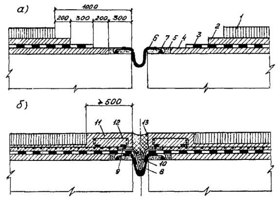 3.6.4. При ступенчатой вырубке слоев одежды асфальтобетон удаляют на ширине 1 м от шва с обеих сторон, затем снимают защитный слой на ширине 0,8 м, удаляют изоляцию на 0,5 м, а выравнивающий слой - на 0,2 м. 3.6.5. На пролетных строениях, где деформационные швы выполнены в виде швов заполненного типа ремонт проводят при появлении следующих дефектов: разрушении и продавливании компенсатора и заполнения в зазоре, нарушении герметизации шва, выкрашивании мастики, выпучивании покрытия в зоне шва и др. Ремонт деформационных швов заполненного типа рекомендуют выполнять в соответствии с указаниями [9]. Конструкция деформационного шва, включающего компенсатор (металлический или неметаллический), гидроизоляционный слой, дополненный полиэтиленовой пленкой, уплотнитель в уровне защитного слоя и заполнитель (пористый материал и мастику на битумной основе), показана на рис. 7. Рис. 7. Последовательность ремонтных работ при реконструкции швов заполненного типа: а - ступенчатая вырубка слоев одежды и установка компенсатора; б - устройство гидроизоляции покрытия и заполнение зазора; 1 - асфальтобетонное покрытие; 2 - защитный слой; 3 - гидроизоляция; 4 - выравнивающий слой; 5 - полимерраствор; 6 -металлический компенсатор; 7 - продольный стержень; 8 - рулонный изоляционный материал; 9 - полиэтиленовая пленка; 10 - пористый заполнитель; 11 - бетонный прилив; 12 - арматурный каркас; 13 - мастика 3.6.6. Новый компенсатор изготавливают из латуни по ГОСТу 931-78 или оцинкованного железа по ГОСТу 8875-56. Старый компенсатор очищают от грязи и ржавчины и покрывают двумя-тремя слоями битумного лака. Затем его устанавливают на место, закрепляя сваркой к обнаженным стержням продольной арматуры плиты, и бетонируют выравнивающий слой раствором. Марка цемента раствора должна быть не ниже 500. 3.6.7. Затвердевшую поверхность бетона очищают, затем укладывают грунтовку из битумного лака и гидроизоляцию из трех слоев битумной мастики, армированной стеклотканью. Гидроизоляцию подводят к компенсатору и укладывают по его контуру. Затем по изоляции расстилают полиэтиленовую пленку и закладывают в компенсатор пористый материал (пеньковый канат) в два ряда по высоте. После восстановления покрытия в местах выруба и подготовки зазора в него заливают мастику, нагретую в котле до температуры +160°С. Предварительно зазор прочищают сжатым воздухом и смазывают стенки битумной грунтовкой. 3.6.8. Мастика для заполнения на основе ДСТ состоит из битума марки БНД 60/90 (96%) с добавками ДСТ (4%). Для устройства деформационных швов используют: авторемонтер ДЭ-5, силовой агрегат РД-903, щетки электрические ДС-505, установку СБ-30, каток ручной Т-207М, котел битумный - 9178 и для разогрева мастики Т-204, приспособление для заливки швов Т-201, кисти для нанесения битумных мастик. 3.6.9. При ремонте старых деформационных швов возможна замена их на новые конструкции, обладающие повышенной надежностью по сравнению с примененными. Выбор конструкции шва определяют действительными величинами перемещений ремонтируемых швов. Рекомендуемые типы деформационных швов приведены в таблице 3.3. Таблица 3.3 Область возможного применения типов деформационных швов в зависимости от величины перемещений
