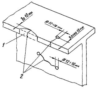 Минимальное расстояние между центрами заклепок в ряду равно 3d; по диагонали - 3,5 d; от центра заклепки до края элемента - 1,5d. Максимальное расстояние между центрами заклепок по крайнему ряду - 160 мм; по среднему ряду - 24d (для сжатия вдоль элемента - 16 d). 4.3.6. Выбор способа ремонта определяют на основании технико-экономического сравнения вариантов с учетом трудоемкости работ, необходимого оборудования, механизмов и материалов. Наиболее простой способ - добавление металла на поврежденную часть элемента. Его рекомендуют в основном для клепаных конструкций и элементов, когда повреждены отдельные ветви сечения. Если ослабление элемента в целом составляет более 20-30%, то следует производить его замену (полную или частичную), так как такой элемент уже может находиться в перенапряженном состоянии от постоянной нагрузки. При повреждении сварного элемента вопрос его восстановления должен быть решен со специалистами по сварке, ибо здесь наиболее эффективным способом является или заварка дефекта (трещин, пробоин), или приварка накладок. Ремонт таких элементов необходимо проводить по специальным проектам. Если сварка элемента недопустима, то его или восстанавливают с применением накладок на высокопрочных болтах, или заменяют на новый. Рис. 10. Схема удаления и засверливания трещин: 4.3.7. Перед выполнением работ по восстановлению элементов производят соответствующую обработку поврежденных мест (рис. 10). Если на кромке имеется трещина длиной менее 10 мм, ее вырубают острым зубилом. Образующееся углубление обрабатывают наждачным кругом или напильником до образования плавных переходов. При ослаблении сечения элемента более 2% производят проверку расчетом допустимости полученного ослабления. Трещины длиной более 10 мм по ее концам обязательно засверливают на всю толщину элемента (листа или уголка) для предотвращения дальнейшего ее развития. Для этого керном отмечают концы трещины, а затем просверливают в этих местах отверстия диаметром 12-16 мм. Если расположение трещины не влияет на грузоподъемность элемента, то его оставляют под наблюдением без соответствующего усиления. Трещину, имеющую опасное расположение, при ремонте перекрывают накладками. Засверленные отверстия окрашивают на всю их глубину. Трещину в сварных швах (наружные) вырубают острым зубилом с последующей зачисткой их наждачным кругом. При обработке трещин используют электродрель, молотки слесарные, керны, скобы, кисти и бачки с краской. Из элементов с глубокими вмятинами, пробоинами, рваными и погнутыми полками, искривленными участками, которые невозможно исправить, вырезают деформированную часть, выправляют небольшие погнутости, очищают от грязи и ржавчины участки, которые будут перекрыты накладками. В элементах с местной глубокой коррозией металла очистку от ржавчины производят наждачным кругом или пескоструйными аппаратами. После подготовки поврежденный элемент восстанавливают. 4.3.8. Ремонт элемента клепаных конструкций с добавлением металла выполняют путем перекрытия ослабленного (или поврежденного) сечения накладками на высокопрочных болтах. Работы по ремонту поврежденного сечения элемента предусматривают следующие операции: установку ограждений и устройство подмостей, подготовку оборудования и инструмента, замеров поврежденного элемента, заготовку дета