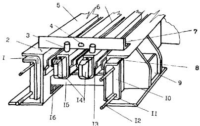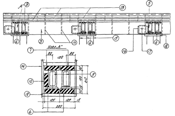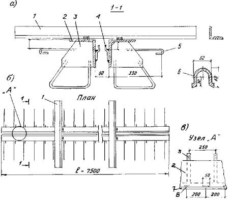 Рис. 2.5. Продольный разрез шва 3K8-150. 3 - 13 (см. обозначения на рис. 2.4); 14 - ребро жесткости окаймления; 15 - анкера; 16 - задвижка; 17 - держатель задвижки; 18 - нижняя плита ниши Рис. 2.6. Промежуточный элемент (а) и работа распределительного устройства (б - г) шва 3К8-150: а - положение промежуточных элементов (план); б - распределительное устройство при максимальном сжатии шва; в - то же в среднем положении; г - то же при максимальном раскрытии шва: 1 - продольная балка; 2 - фиксатор; 3 - поперечная балка; 4 - концевой упор поперечной балки; 5 - средний упор поперечной балки; 6 - упор на окаймление (задвижка); 7 - амортизатор распределительного устройства; 8 - окаймление Фиксаторы приварены к уголку окаймления и промежуточной балке. Для равномерного распределения перемещений между компенсаторами в конструкции шва имеются распределительные устройства в виде резиновых прокладок, расположенных вертикально между упорами (рис. 2.3). Расстояние между ними принято таким, что при температуре конструкций 15 °C и выше прокладки не обжаты. 2.4. Конструкция шва 3К8-150 (рис. 2.4 и 2.5) выполнена аналогично конструкции 2К8-100, но с двумя промежуточными продольными балками и тремя рядами компенсаторов. Поперечные балки-опоры входят в ниши окаймления попарно. Окаймляющие элементы одинаковы со швом 2К8-100. Распределительные устройства (рис. 2.6) расположены в конце одной поперечной балки, между ними и в конце другой поперечной балки. Предусмотрена возможность замены прокладок. Во всех швах крепление компенсаторов однотипно. 2.5. Для сталежелезобетонных пролетных строений конструкции модульных швов 2К8-100 и 3К8-150 изготавливают со сплошной опорной плитой, которую крепят к пролетному строению болтами. Монолитный бетон плиты проезжей части доводят до низа конструкции шва. Под опорную плиту в местах крепления к балкам укладывают при необходимости клиновые подкладки. 2.6. Длины железобетонных и сталежелезобетонных пролетных строений, в которых допускается применение швов К8-55, 2К8-100 и 3К8-150, даны в табл. 2.1 в зависимости от района расположения моста. При проверке возможности применения тех или иных конструкций швов на эксплуатируемых мостах (как железобетонных, так и сталежелезобетонных) следует пользоваться данными табл. 2.2 Под длиной пролетного строения следует понимать длину, с которой собираются перемещения в деформационный шов. Таблица 2.1 Область применения швов с резиновыми компенсаторами