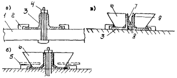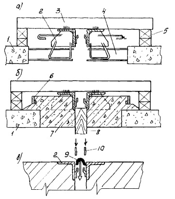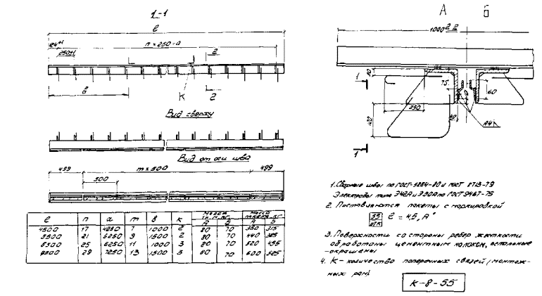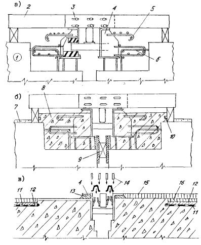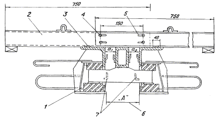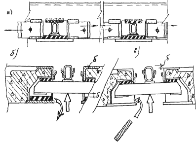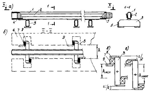 Имеющиеся поперечные балки на концевых участках реконструируемых сталежелезобетонных пролетных строений усиливают. 2. КОНСТРУКЦИИ ШВОВ С РЕЗИНОВЫМИ КОМПЕНСАТОРАМИ И ОБЛАСТЬ ИХ ПРИМЕНЕНИЯ2.1. Рекомендуется применять конструкции швов трех видов: К8-55, 2К8-100 и 3К8-150. Конструкции используют в железобетонных и сталежелезобетонных пролетных строениях мостов, расположенных на дорогах I-V технических категорий в районах, где минимальная среднесуточная температура воздуха на 5 °C (не менее) выше температуры хрупкости резины компенсатора tнс ≥ tхр + 5 °С, где tнс - минимальная среднесуточная температура воздуха; tхр - температура хрупкости. Область применения конструкций швов с компенсаторами из резины (см. п. 3.4) ограничивается районами с tнс = -50 °С. В более холодных условиях используют резину специального подбора или применяют швы со стальными скользящими листами. 2.2. Конструкция шва К8-55 (рис. 2.1, а) включает в себя два уголка с ребрами жесткости с внутренней стороны и фиксаторами с наружной стороны профиля. Фиксатор приварен к полке электрозаклепками и продольными (фланговыми) прерывистыми швами сверху и снизу. Устанавливаемые в фиксатор концы компенсатора заклинивают полосами, которые также приваривают прерывистым швом (l = 40 - 50 мм через 150 ÷ 200 мм) к обушку уголка (рис. 2.1, б) Рис. 2.1. Монтажный пакет шва К8-55 1 - монтажная рама; 2 - окаймление; 3 - ребро жесткости; 4 - фиксатор; 5 - анкер; 6 - компенсатор; 7 - полоса, заклинивающая компенсатор; 8 - сварной шов Установку компенсатора, заклинивание и приварку полос осуществляют на монтаже. Завод-изготовитель поставляет швы полной готовности монтажными пакетами с объединяющими связями. Размеры пакетов и геометрические характеристики конструкций изложены в каталоге завода-изготовителя, данном в прил. 1. В комплект конструкций швов, предназначенных для установки в эксплуатируемых мостах, входят также крепежные детали и дополнительные опорные пластины, изготавливаемые по чертежам заказчика. 2.3. Конструкция 2К8-100 (рис. 2.2) представляет собой двухмодульный шов с компенсаторами К8, выполненный в виде двух окаймлений с ребрами жесткости и дополнительной вертикальной стенкой, в окна которой входят поперечные балки-опоры, жестко соединенные с продольной промежуточной балкой. Концы балок-опор расположены между резиновыми амортизаторами, исключающими контакт металла с металлом. Рис. 2.2. Конструкция шва 2К8-100 с монтажным устройством 1 - конструкция шва 2К8-100; 2 - монтажное устройство (№ 10 - 14); 3 - прихватка устройства сварной к окаймлению; 4 - стяжные болты устройства (Æ М - 20); 5 - овальные отверстия (l = 50 мм); 6 - установочный размер, зависящий от температуры конструкций (воздуха); 7 - упорные устройства Рис. 2.3. Промежуточный элемент (а, б) и работа распределительного устройства (в, г) шва 2К8-100: а - фасад; б - план; в - распределительное устройство при максимальном сжатии шва; г - то же при максимальном раскрытии шва: 1 - продольная балка; 2 - фиксатор; 3 - поперечная балка; 4 - заглушка; 5 - буш; 6 - окаймление; 7 - амортизатор распределительного устройства; 8 - концевой упор; 9 - упор на окаймлении (задвижка) Рис. 2.4. Деформационный шов 3К8-150 в железобетонном (а) и сталежелезобетонном (б) пролетном строении: 1 - компенсатор; 2 - заклинивающая пластина; 3 - окаймление; 4 - продольная балка промежуточного элемента; 5 - поперечная балка промежуточного элемента