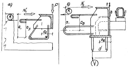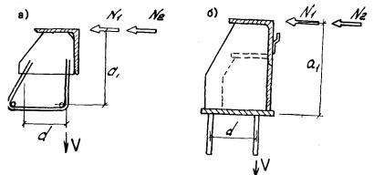 4.4. Амплитуду температурных перемещений определяют по нормативным значениям температур воздуха в соответствии со СНиП 2.05.03-84. Горизонтальные перемещения концов пролетных строений от временной нагрузки δв включают перемещения от вертикальной нагрузки δвв и торможения δвт, учитываемые при: - максимальном раскрытии шва (холодное время года) как сумма перемещений δвв и δвт одного из примыкающих к шву концов пролетных строений; перемещения направлены в сторону раскрытия шва; - максимальном сжатии (теплое время года) как разность этих перемещений, направленных к оси шва. 4.5. При привязке конструкций швов к конкретным объектам следует предусматривать их анкеровку в пролетном строении, обеспечивающую устойчивость конструкции и ее надежное закрепление от действующих нагрузок по сочетаниям А и Б (рис. 4.1, 4.2). Рис. 4.1. Нагрузки на окаймления швов К8 (а) и 3К8 (б). Сочетание А. N1 - горизонтальная временная нагрузка (приложена к верху окаймления); Р - вертикальная временная нагрузка (приложена к обушку уголка); R - реакция в горизонтальных анкерных стержнях; V1 - реакция в вертикальных анкерных стержнях внутреннего ряда При сочетании А (рис. 4.1) определяют реакции в горизонтальных R и вертикальных (внутреннего ряда) V1 анкерных стержнях