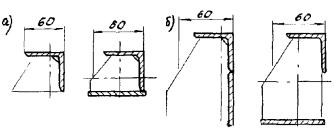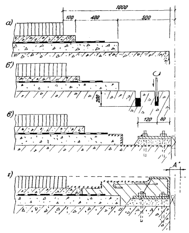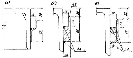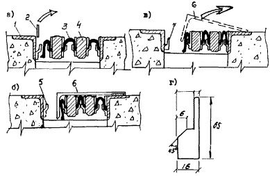 7.5. Работы по повторной локальной заклинке резины выполняют в следующем порядке: - очищают шов сверху, отмечают границы повреждений; - удаляют заклинивающие пластины на участке повреждения и по одной полосе за границами этого участка; - очищают фиксатор от грязи и остатков мастики; - наваривают на фиксатор дополнительную металлическую полосу толщиной 1 - 2 мм в зависимости от фактической толщины резины и ширины просвета в фиксаторе; защищают фиксатор от коррозии; - восстанавливают заполнение (см. п. 6.6). Для удаления заклинивающих пластин срезают прерывистый сварной шов с помощью электро- или пневмоинструмента (наждачного круга), затем отгибают верх пластин зубилом. Повторное использование пластин возможно после их рихтовки. Дополнительную металлическую полосу наваривают с внутренней стороны фиксатора прерывистым сварным швом (электроды толщиной не более 2 мм) с последующей зачисткой швов и округлением кромки. Дополнительную полосу приваривают на длине поврежденного участка и на половине длины фиксаторов, примыкающих к этому участку. 7.6. При регулировке распределительных устройств в случае повреждения упоров осуществляют их приварку в проектное или новое положение. Конфигурация упора может быть иной, чем проектная, для удобства выполнения сварочных работ снизу. Работы по регулировке следует вести при температуре свыше плюс 10 °С. Если работа распределительных устройств нарушена из-за неправильной приварки упора или недостаточной ширины амортизаторов, амортизатор заменяют. Причем, если увеличена ширина зазора над средним компенсатором в швах 3К8-150, то заменяют средний амортизатор, а если над крайним зазором - крайний амортизатор. Для его замены отодвигают заслонку ниши, а заменяя средний - снимают нижний ограничитель (см. рис. 2.4 поз. 9). Перед установкой нового амортизатора выправляют положение продольных промежуточных балок домкратами или клиньями сверху. Необходимо следить, чтобы зазоры между амортизаторами и упорами были одинаковы. 7.7. Для замены поврежденных фиксаторов удаляют заклинивающие пластины, (см. п. 7.5), отклоняют резину в сторону, а для модульных швов - отодвигают к одному окаймлению промежуточную продольную балку (балки) с помощью домкратов или клиньев, удаляют поврежденный фиксатор, тщательно очищают место расположения фиксатора и приваривают новый. Новый фиксатор может отличаться от старого (рис. 7.2 и 7.3) и приваривается сварным швом сверху (катет шва 8 - 10 мм) за один или несколько проходов (послойная наплавка). Рис. 7.2. Замена фиксатора в шве 3К8-150: а - удаление заклинивающей полосы и освобождение фиксаторов; б - смещение промежуточных элементов и закрепление их в сдвинутом состоянии; в - замена поврежденных фиксаторов и удаление крепежных элементов; г - новый фиксатор: 1 - окаймление; 2 - заклинивающая пластина; 3 - компенсатор; 4 - промежуточный элемент; 5 - фиксатор; 6 - крепежный элемент; 7 - новый фиксатор Рис. 7.3. Возможные виды фиксаторов: а - штампованный из полосы δ = 4 мм; б - фрезерованный из толстолистовой стали; в - составной из обрезанного уголка 65×4 Заявка на конструкции деформационных швов поступает от строительной организации в Объединение «Автомост» с указанием типа деформационных швов, длины пакетов и их количества, длины резиновых компенсаторов.