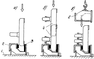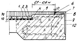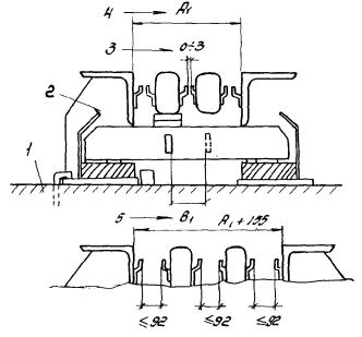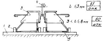 где ΔV - дополнительное усилие в анкерах одного ряда в пределах длины Lо; в3, δ3 - ширина и толщина закладной детали, м; lа - шаг анкеров, м; Kt - коэффициент, зависящий от перепада температуры между верхом и низом закладной детали: при δ3 ≤ 12 мм Кt = 0,005 при δ3 > 12 мм Кt = 0,004 4.9. При применении модульных швов концевые участки плит проверяют следующим расчетом: на прочность составного сечения по моменту и поперечной силе - в случае установки в железобетонных пролетных строениях; на прочность окаймления и сварных швов без учета бетона омоноличивания - при установке в сталежелезобетонных пролетных строениях. Расчетом проверяют достаточность армирования бетона монолитного участка на ширине В = Н и сечение нижнего листа окаймления. В качестве расчетной принимают нагрузку от оси тележки АК и полосовую нагрузку. В расчете учитывают сечения, приведенные на рис. 4.4. 4.10. При привязке конструкций швов к строящемуся или реконструируемому сооружению берут в расчет следующие требования: - диаметр арматуры хомутов и анкеров не должен быть меньше 16 мм (периодическая арматура) или 20 мм (гладкая арматура); - конструкции целесообразно устанавливать на всю ширину пролетного строения, совмещая их с тротуарами, располагаемыми в уровне проезжей части; - толщину закладных пластин выбирают равной 12 - 15 мм, а опорных пластин в модульных швах - 20 - 22 мм; - толщину резиновых амортизаторов принимают одинаковой и равной 30 или 40 мм; - в месте примыкания шва к тротуару в бордюре и на шве закрепляют кожух и пластины, закрывающие доступ грязи под тротуар и в щель между ним и швом; - с фасада конструкции швов закрывают декоративным листом. 5. ИЗГОТОВЛЕНИЕ КОНСТРУКЦИЙ ДЕФОРМАЦИОННЫХ ШВОВ И КОНТРОЛЬ КАЧЕСТВА5.1. Конструкции деформационных швов изготавливают в заводских условиях блоками длиной от 4,5 до 7,5 м максимальной заводской готовности. Шаг номенклатурного ряда длин заводских блоков принят равным 1 м. При необходимости могут быть изготовлены конструкции иных размеров при наличии в проекте документации в соответствии с требованиями р. 1 настоящих Рекомендаций. Номенклатура конструкций дана в прил. 1. Конструкции делают на стенде, позволяющем фиксировать и закреплять их от смещения в двух направлениях. 5.2. В процессе изготовления конструкции проверяют на возможность обеспечения расчетного диапазона перемещений (контроль по перемещениям). Для этого одно из окаймлений блока шва К8-55 закрепляют на стенде (сборочном столе) и вплотную придвигают противоположное окаймление. Показателем возможности обеспечения заданных перемещений является величина просвета между соприкасающимися фиксаторами, не превышающая 3 мм (рис. 5.1). В этом случае ставят знак ОТК, подтверждающий допустимые перемещения (55 мм) на каждый собранный блок. Если же зазоры находятся в пределах 8 мм, то на шов ограничивают перемещения до 50 мм и ставят соответствующий знак ОТК (например, ОТК-50). Рис. 5.1. Контроль качества по перемещениям шва К8-55: 1 - стенд; 2 - упор; 3 - шов; 4 - контролируемый размер Зазоры свыше 8 мм не допускаются. Собранные конструкции модульных швов (крышки к ним при этом отсутствуют) закрепляют с одной стороны на стенде (сборочном столе) и сдвигают вплотную окаймления (рис. 5.2). Зазоры между фиксаторами не должны превышать 3 мм (ОТК-100 или ОТК-150). При этом размер между упорами шва должен находиться в пределах в + 20 