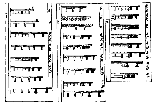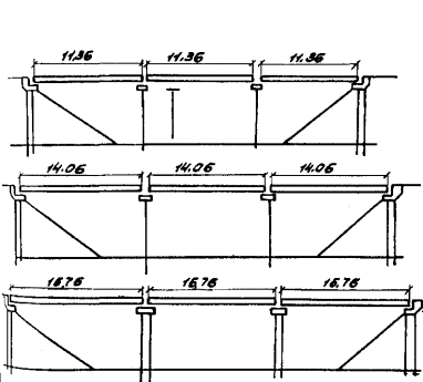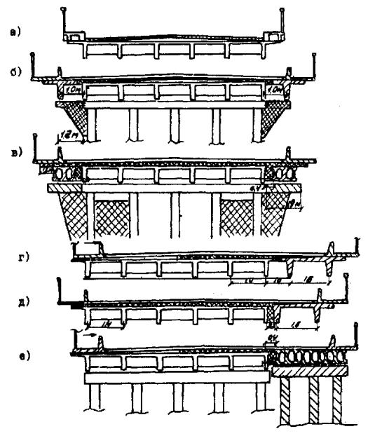 В таблицах 2.5 и 2.6 приняты обозначения: С - ширина разделительной полосы; У - уширение; Р - строительство рядом моста под одно направление движения; У+Р - то же, с уширением существующего; Т - увеличение габарита за счет смещения (удаления) тротуаров; РТ - строительство рядом моста под одно направление движения с увеличением габарита на существующем за счет смещения (удаления) тротуаров; Н - новое строительство (замена моста). Прочерк означает, что габарит может быть оставлен без изменения. 2.3.4. В отдельных случаях, например, оговоренных в п. 2.2.9, при габаритах, не указанных в таблицах 2.5 и 2.6, а также при наличии особых условий на эксплуатируемом участке дороги (отсутствие объезда, высокий уровень воды на период реконструкции и др.) целесообразность уширения устанавливают на основании технико-экономического обоснования в соответствии с рекомендованной в прил. 2 методикой. 2.4. Основные принципы уширения. Классификация методов уширения2.4.1. При выборе схемы уширения пролетного строения учитывают состояние конструкций, величину уширения, тип уширяемых конструкций и тип конструкций, используемых при уширении моста. По состоянию конструкции мосты могут быть отнесены к трем категориям: I - мост соответствует по грузоподъемности требуемой для данной категории дороги, Kн = 1,0; Kд =1,0; II - грузоподъемность моста снижена, 0,7 < Kн £ 1,0; Kд = 0,7; III - грузоподъемность моста значительно ниже требуемой для данной категории дороги, Kн £ 0,7; Kд = 0,4. 2.4.2. В зависимости от размера увеличения габарита различают несколько методов уширения: А - за счет смещения (удаления) тротуаров, сопровождающегося при необходимости наращиванием консоли плиты балок - уширение на 1 м (в отдельных случаях до 1,5 м); Б - устройство монолитной накладной плиты поверх несущих конструкций - уширение до 1,5 м (в отдельных случаях до 3 м без специальных мер по усилению); В - пристройка дополнительных балок с двух сторон с удлинением ригеля промежуточных опор - уширение до 2-2,5 м; Г - то же, с уширением тела опоры - уширение до 3-3,5 м; Д - уширение с развитием всей опоры (с фундаментом), строительством новых опор - уширение свыше 4 м. Причем каждый из этих методов может быть использован при уширении мостов с пролетными строениями: 1 - сборными ребристыми с диафрагмами; 2 - то же, без диафрагм; 3 - сборными плитными; 4 - монолитными ребристыми. 2.4.3. При уширении пролетных строений с каркасной арматурой следует применять такие схемы, которые обеспечивают наряду с увеличением габарита повышение грузоподъемности моста или приведение грузоподъемности моста к требуемой, увеличение долговечности эксплуатируемых элементов, снижение уровня воздействия временной нагрузки на них. Это реализуется за счет разгрузки существующих балок, устранения возможных очагов повреждения конструкций, улучшения фасада сооружения, в различных типах эксплуатируемых пролетных строений это достигается по-разному. 2.4.4. При разработке проекта уширения моста (по группе В-Д, см. п. 2.4.2) со сборными диафрагменными пролетными строениями (выпуск 10, 11, 56) с оценкой состояния «удовлетворительно» рекомендуется соблюдать следующие положения: увеличение габарита достигают добавлением новых элементов пролетных строений с двух сторон (симметрично либо несимметрично); добавляемые балки (плиты) максимально приближают к крайним балкам существующих пролет