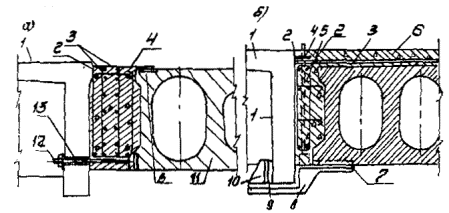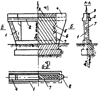 1. Накладные детали в плитах для объединения с ребром балки: 1 - ребристая балка; 2 - закладная деталь по верху плиты; 3 - приставляемая плита; 4 - закладная деталь по низу плиты; 5 - опалубочный щит; 6 - натяжной болт; 7 - гайка и шайба болта