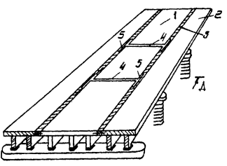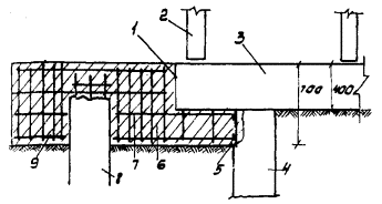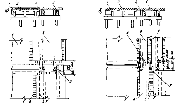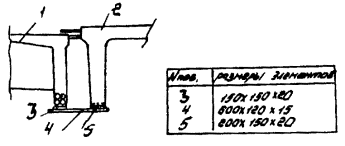 3. Стальные детали для объединения ребристых балок: 1 - существующая балка; 2 - новая приставляемая балка; 3 - приваренная к арматуре пластина; 4 - соединительная накладка; 5 - закладная деталь