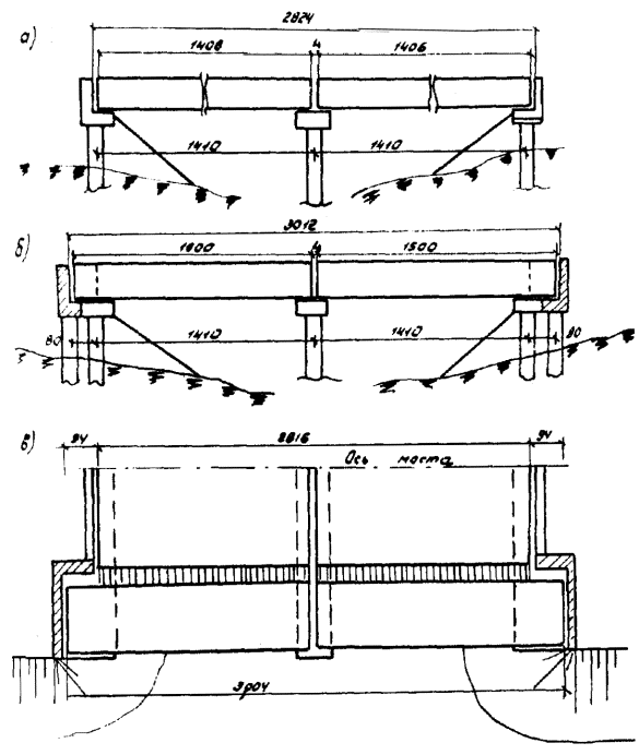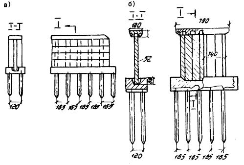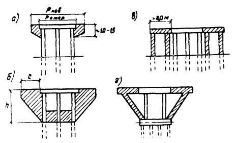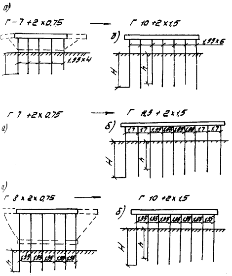 Рис. 4.1. Условные схемы уширения опор: а - без развития тела; б, г - с развитием тела опоры, но без развития фундаментов; в - то же с развитием фундамента 4.2.2. Свайные промежуточные опоры. При уширении моста на 1-2 м уширение свайной опоры может быть осуществлено за счет удлинения и усиления только насадки, жестко объединяемой с существующей ее частью (см. рис. 3.3). При уширении моста на 3,0-3,5 м рекомендуется превращение свайной опоры в свайно-стоечную, как это показано на рис. 4.1 б. При этом допускается часть опоры омоноличивать в виде стенки, а штыревое соединение по торцу насадки не устраивать. Арматуру цокольной части соединяют с оголенной вертикальной арматурой стоек-свай. При уширении моста на 4-5 м дополнительные сваи забивают на расстояниях, близких к существующим в опоре. Новая часть насадки может не омоноличиваться с существующей в случае принятия мер для предотвращения неравномерных осадок. Допустимая разница в осадках определяется надежной работой пролетных строений в поперечном направлении и может быть принята в пределах, при которых относительное вертикальное смещение приставляемой балки по сравнению с ближайшей существующей не превышает 0,001 В (В - расстояние между балками) - в диафрагменных пролетных строениях и 0,002 В - в бездиафрагменных. В остальных случаях насадки должны быть объединены. 4.2.3.* Для предотвращения чрезмерной осадки несущая способность пристраиваемой части опоры по грунту и материалу свай должна быть увеличена; степень увеличения несущей способности дана в табл. 4.2. * В пункты, отмеченные звездочкой, включены требования, приведенные в [2]. Таблица 4.2