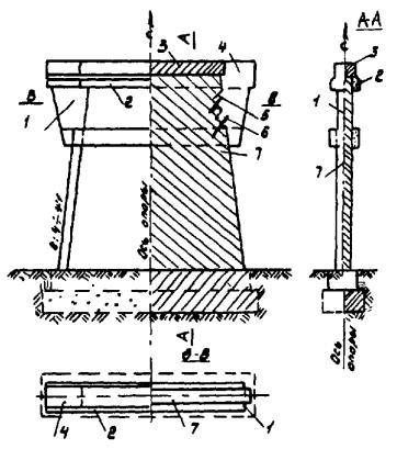4.2.4. Свайно-стоечные опоры. Стоечные опоры. При отсутствии необходимости уширения фундамента уширение свайно-стоечных и стоечных опор может быть осуществлено либо за счет удлинения насадки при уширении моста на 1-2 м (аналогично п. 4.2), либо при уширении моста до 4 м с установкой дополнительных подкосов (см. рис. 4.1 б). Последние изготовляют из сборного железобетона с выпусками арматуры, заделываемыми в удлиняемую часть насадки. В качестве подкосов могут быть использованы части железобетонных свай со стержневой арматурой. Нижние концы подкосов устанавливают в предварительно вырубленные ниши в фундаменте (ростверке) с последующим обетонированием. Угол отклонения подкосов от вертикали следует принимать не более 30°. Расстояние от верха подкосов до существующих стоек должно быть не более 2,0 м. Части удлинения стоечных опор должны быть соединены со старой опорой сваркой арматуры. 4.2.5. Для восприятия распора от подкосов уширенных стоечных опор под существующей насадкой и к подкосам должны быть прибетонированы железобетонные охватывающие пояса, арматуру которых рассчитывают на полное горизонтальное усилие в насадке (см. рис. 4.1 б). Усиление перегруженных стоек следует производить железобетонными рубашками по насеченной поверхности стоек, рубашки армируют сварными каркасами. При уширении фундамента уширение тела опор производят достройкой конструкции, аналогичной существующей (см. рис. 3.8, 3.11). 4.2.6. При увеличении ширины ригеля по схеме «б» рис. 4.1 должна быть обеспечена надежная связь добавляемой части с существующей конструкцией как за счет штырей, устанавливаемых в просверленные в торце ригеля отверстия, так и за счет сплошной продольной арматуры, соединяющей новые элементы с двух сторон опоры. Сплошную арматуру вдоль ригеля располагают либо в бетонной рубашке, либо в монолитном бетоне добетонирования старого ригеля. Допустимо применение в качестве продольного связующего элемента прокатного стального профиля, например швеллера. 4.2.7.* Монолитные опоры и опоры-стенки. При отсутствии необходимости уширения фундамента тело опоры рекомендуется уширять пристраиваемыми массивами из монолитного железобетона, опертыми на обрезы существующих фундаментов (рис. 4.2). Рис. 4.2. Уширение массивных промежуточных опор (из ВР 218 УССР): обозначения см. на рис. 4.3. Минимальный размер пристраиваемого массива по низу принимается равным 50 см, а максимальный по верху - 2,0 м, но не более половины высот опоры. Размер штрабы не менее 30 ´ 30 см. В штрабах устанавливают анкера диаметром не менее 25 мм из арматуры класса А-II. Глубина шпуров - не менее 15 диаметров анкера. Расстояние между анкерами - 50 см. 4.2.8.* При высоте массивной опоры свыше 5 м и достаточных запасах в несущей способности опор по грунту допустимо уширение ригеля до 2,5 м в каждую сторону. При этом рекомендуется устраивать приштрабованные массивы с большими консолями. Пристраиваемые железобетонные массивы по верху и по низу опоры должны быть прикреплены охватывающими железобетонными поясами с арматурой, проходящей на всю ширину опоры. 4.2.9. При значительном наклоне торцевых граней массивных опор (от 4:1 до 6:1) допускается уширение их приштрабованными массивами только в верхней части опоры (рис. 4.3). Высота массивов должна быть не менее 3,0 м. Нижний охватывающий пояс, являющийся упором для массивов уш