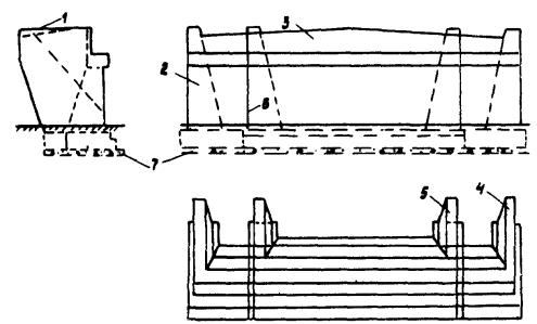 Требования по проектированию (расчету) накладок даны в [11]. 5.2.11. В отдельных случаях компоновку пристраиваемых пролетных строений уширяемого моста можно осуществлять с помощью балок меньшей длины, чем в существующем пролетном строении, а именно: l = 21 м при уширении l = 22,16 м; l = 15 « -»- l = 16,76 «. При этом изменяется конфигурация опор в связи с тем, что ширина насадки существенно увеличивается (рис. 5.4). Новые балки изготавливают с недобетонированными концевыми участками или с выпусками арматуры для последующей стыковки в ТНПС. Шкафную стенку, как и в случаях, показанных на рис. 5.1 и 5.2, выполняют ступенчатой с выступом к середине моста. 6. ИЗГОТОВЛЕНИЕ КОНСТРУКЦИЙ, ОРГАНИЗАЦИЯ И ПРОИЗВОДСТВО РАБОТ6.1. Изготовление сборных конструкций6.1.1. Элементы пролетных строений (балки, плиты) изготавливают в существующих опалубках с использованием перемещаемых торцевых щитов и вставок на дно опалубки, позволяющих выпускать элементы требуемых длин (отличаются от опалубки под современные длины на 0,64 - 1,84 м1, а для ребристых пролетных строений - и уменьшенной при необходимости высоты. При относительной ширине рекомендуемого сооружения Анов / Астар £ 1,5 (уширения с Г-6 до Г-8, с Г-8 до Г-10, с Г-9 до Г-11,5) балки пролетных строений делают с недобетонированной плитой по концам для объединения в температурно-неразрезную цепь (ТНПС). При большем соотношении ширины пролетных строений балки изготавливают с обычными концевыми участками, а их объединение в ТНПС следует осуществлять по продольным стыкам омоноличивания. 1 В отдельных случаях не требуется изменения длины балок (см. разд. 5). 6.1.2. При выпуске пустотных плит с закладными деталями для объединения в поперечном направлении закладные детали по низу с двух сторон плиты соединяют арматурой без разрыва. Сечение поперечной арматуры, соединяющей закладные детали, определяют расчетом по величине изгибающего момента поперек моста. Поперечную арматуру приваривают не к закладной детали, а к вертикальному ребру жесткости. Верхние закладные детали, предназначенные для объединения плит в ТНПС, могут быть установлены в бетонируемых стыках. Закладные детали должны иметь вертикальные и горизонтальные стержни для воспринятия соответствующих усилий в соединительном элементе. Размеры закладных деталей даны в прил. 6. 6.1.3. Тротуарные балки, перила, ограждающие устройства изготавливают в соответствии с требованиями типовых проектов. Один из блоков на длине пролета делают измененной длины под размер эксплуатируемого пролетного строения. Сборные элементы уширения опор производят в заводских (полигонных) условиях, соблюдая требования по материалам, бетонированию и уходу за бетоном в соответствии с [15]. 6.2. Организация работ6.2.1. Работы по уширению мостов в зависимости от длины моста и сложности работ могут выполнять: специализированные мостовые прорабства при ДРСУ или автодорах (увеличение габарита за счет удаления тротуаров, схемы уширения, не требующие полного удаления консолей крайних балок, не требующие свайных работ, уширение однопролетных мостов); мостовые ремонтно-строительные управления при автодорах или объединениях - МРСУ; мостостроительные управления МСУ при объединениях. 6.2.2. Уширение пролетных строений и опор желательно выполнять без полного закрытия движения по мосту, а лишь с ограничением пропускной спо
