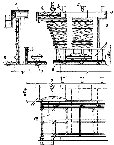 Примечание. В скобках - для бездиафрагменных пролетных строений. Домкраты располагают симметрично относительно оси моста. В пролетных строениях с шестью балками домкраты располагают между двумя крайними балками и посредине пролетного строения (при трех домкратах). Допускается упирать домкраты в плиты балок через брусья. При использовании двух домкратов их располагают под вторыми балками и упирают в распределительный ригель. При семи балках в поперечном сечении обязательно использование распределительного ригеля. Для подъемки применяют либо шальную клетку, либо инвентарные рамы, опираемые на грунт или обрез фундамента опоры, что определяют при проектировании. Работы ведут при наличии подмостей. Целесообразно использовать ручные насосные установки (прил. 7). 6.3.3. Удаление консолей плит может быть осуществлено с помощью пневмоинструмента (например отбойных молотков). 6.3.4. Обстройку опоры с ростверком при необходимости уширения тела опоры и ригеля (уширение моста до 4 м) выполняют в два этапа: на первом этапе с одной стороны опоры устанавливают подмости, обеспечивающие монтаж опалубки с одной плоскости опоры на всю высоту (поз. 4 рис. 6.4), а также приемку бетона для бетонирования на высоту до 1,2 м (рис. 6.4 а); на втором - рабочую площадку с бадьей бетона поднимают на высоту 2 м, для чего разбирают инвентарные щиты с рельсом, устанавливают на нужную высоту (2 м) подмости (инвентарные леса) и вручную, либо краном с проезжей части, на приемную площадку (поз. 4 рис. 6.4) подают щиты и бадью. По всей плоскости наращивают опалубку выше на 0,5 м уровня бадьи под бетон. Бетонирование ведут, перемещая бадью вдоль опоры, периодически наполняя ее на приемочной площадке (рис. 6.4 б). Объем бадьи составляет 0,5 м3. 6.3.5. Перед установкой плиты (балки), ближайшей к крайней балке уширяемого пролетного строения, с фасадной поверхности существующей крайней балки удаляют слабый или поврежденный бетон. При этом пользуются люлькой, закрепляемой на уже приставленной или подготовленной крайней балке. Допускается подготовка поверхности перед работами по уширению моста с помощью специальной перемещаемой люльки, прикрепленной к любому транспортному средству, которое расположено на пролете (см. прил. 7 и [19]). Целесообразно при омоноличивании приставляемых элементов с существующей конструкцией применять бетон повышенной прочности и плотности, в том числе и с пластифицирующими добавками, улучшающими его удобоукладываемость. 6.3.6. Сверление отверстий в бетоне для стыковки ригелей опор и объединения балок с плитами выполняют пневмосверлильными инструментами (например ИП-1023) и полыми сверлами с алмазной коронкой. Техническая характеристика пневмосверлильной установки ИП-1023: Рис. 6.4 Этапы обстройки промежуточной опоры: а - при бетонировании нижнего яруса (с земли); б - при бетонировании верхнего яруса 1 - ригель; 2 - стойка; 3 - подвесная люлька; 4 - опалубка опоры; 5 - балка пролетного строения; 6 - щитовая опалубка нижнего яруса; 7 - бадья для бетона на рабочей площадке; 8 - рельсовый путь на сборных щитах; 9 - рабочий ход; 10 - подача материалов сверху; 11 - верхний ярус щитовой опалубки; 12 - средний ярус щитовой опалубки. Для сверления отверстий используют кольцевые алмазные сверла марки СКА-2. Установка обеспечивается водой с расходом 2 л/мин, подаваемой с высоты не менее 2 м. 6.3.7. При объе