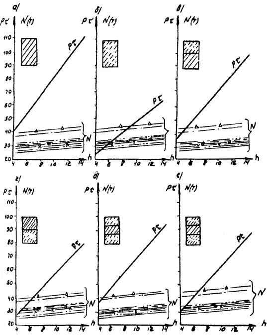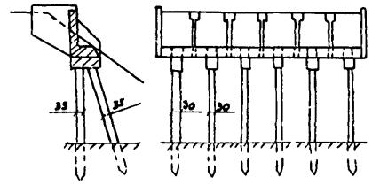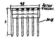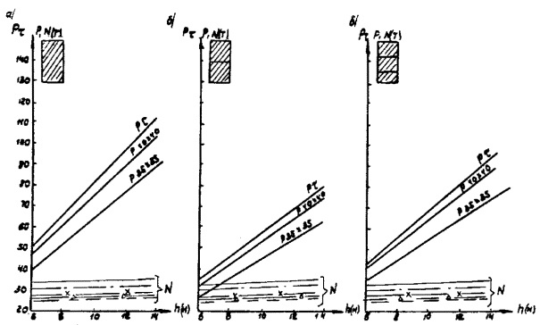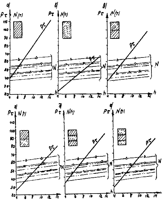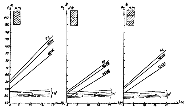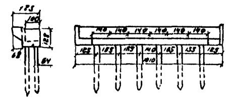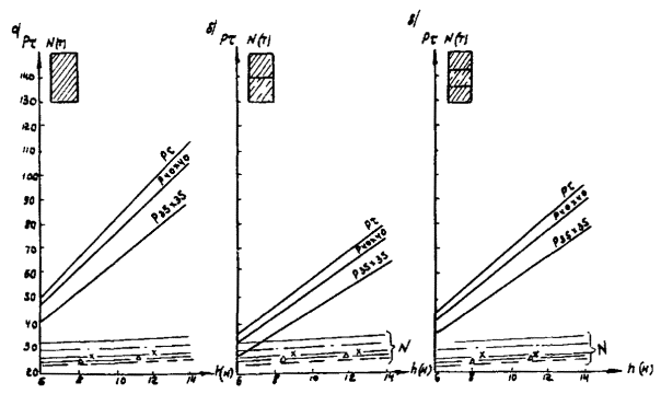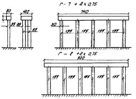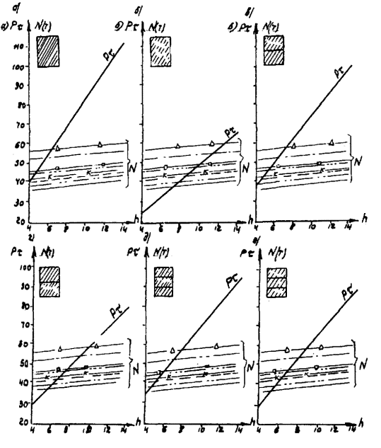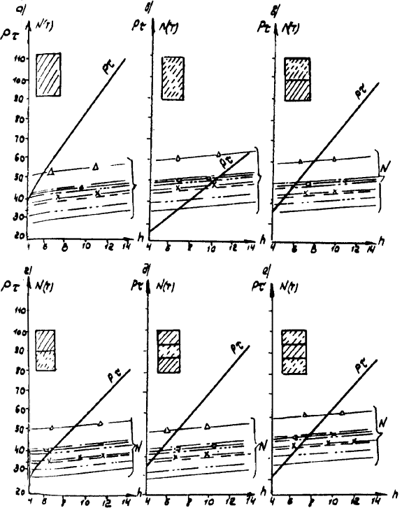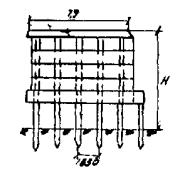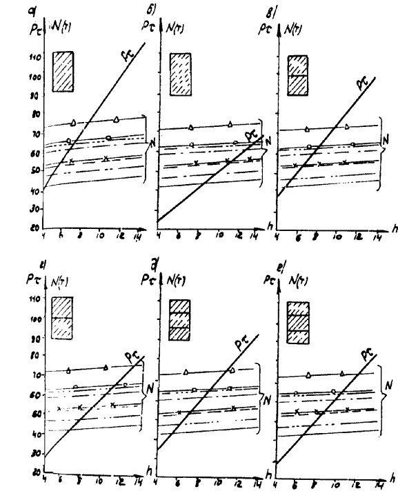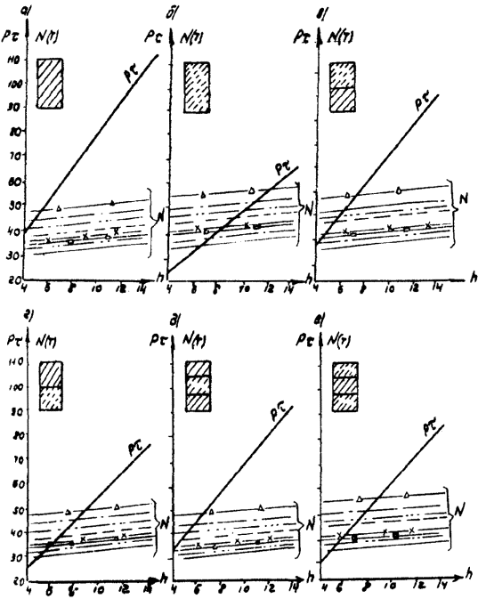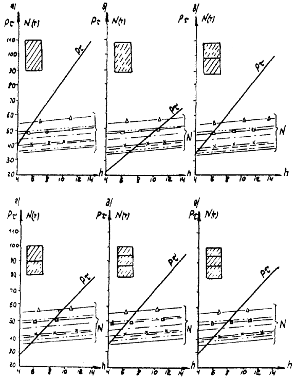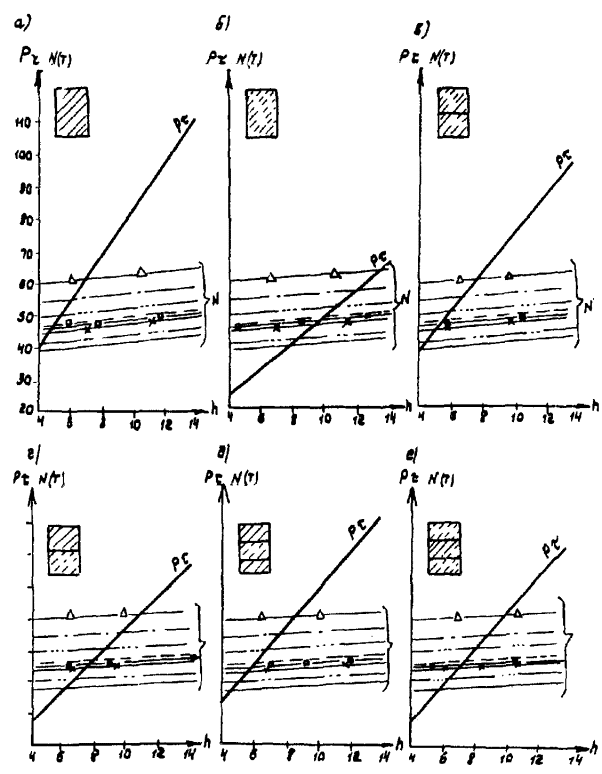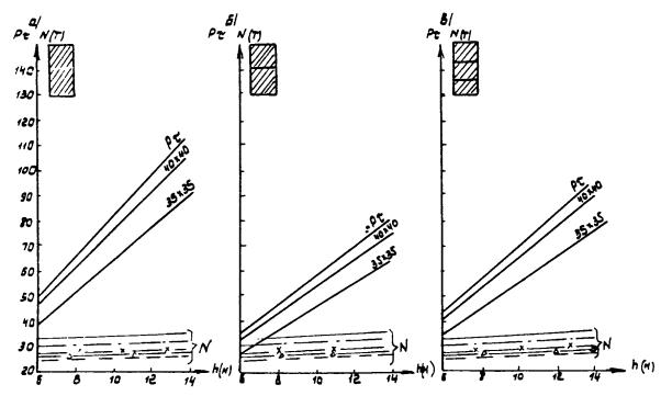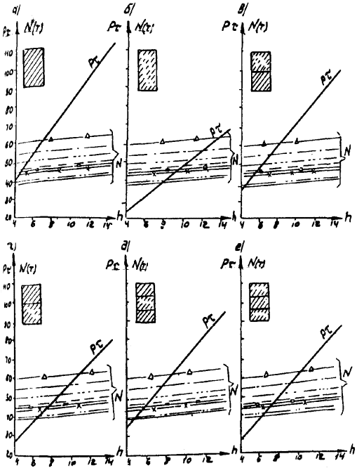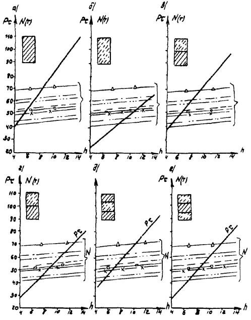 Рис. А-3 (окончание) Рис. А.4. N1 - Г7 + 2´0,75 Г8 + 2´1,0 nсв = 5; N2 --- Г7 + 2´0,75 ® Г8 + 2´1,0 nсв = 7; N4 -×- Г7 + 2´0,75 ® Г10 + 2´1,5; N6 - Г7 + 2´0,75 ® Г11,5 + 2´1,5; N8 -D- Г8 + 2´0,75 ® Г10 + 2´1,5; N3 -××- Г7 + 2´0,75 Г10 + 2´1,5; N5 -×××- Г8 + 2´0,75 ® Г10 + 2´1,5 Рис. А.5 N1 - Г7 + 2´0,75 Г8 + 2´1,0 nсв = 5; N3 -××- Г7 + 2´0,75 Г10 + 2´1,5 nсв = 5 N2 --- Г7 + 2´0,75 Г8 + 2´1,0 nсв = 7; N5 -×××- Г8 + 2´0,75 Г10 + 2´1,5 nсв = 6 N4 -×- Г7 + 2´0,75 Г10 + 2´1,5 N6 -к- Г7 + 2´0,75 Г11,5 + 2´1,5 N8 -D- Г8 + 2´0,75 Г10 + 2´1,5 Рис. А.6. N1 - Г7 + 2´0,75 Г8 + 2´1,0 nсв = 5; N3 -××- Г7 + 2´0,75 Г10 + 2´1,5 nсв = 5 nсв = 5 N2 --- Г7 + 2´0,75 Г8 + 2´1,0 nсв = 7; N5 -×××- Г8 + 2´0,75 Г10 + 2´1,5 nсв = 5 nсв = 6 N4 -×- Г7 + 2´0,75 Г10 + 2´1,5 N6 -к- Г7 + 2´0,75 Г11,5 + 2´1,5 N8 -D- Г8 + 2´0,75 Г10 + 2´1,5 Б. Опоры на фундаментах в виде высокого свайного ростверка Б.1. Рассмотрены конструкции фундаментов свайно-сточных опор и под опоры - стенки (рис. Б.1), уширение которых осуществляется за счет развития надфундаментной части монолитным бетоном. Длина участка свай, расположенного выше расчетной поверхности грунта, принята равной 2 м. Б.2. На рисунках Б.2-Б.4 приведены графики для опор-стенок, а на рисунках Б.5-Б.7 - для свайно-стоечных опор с облицовкой, в каждом случае для описания на них пролетных строений длиной Ln = 11,36 м; 14,06 и 16,76 м. На графиках даны усилия N, приходящиеся на головы свай при наиневыгоднейшем загружении как вдоль, так и поперек моста. Б.3. Абсциссы точек пересечения линий Pt (расчетной несущей способности существующих свай сечением 30 ´ 35 см с учетом уплотнения грунта за счет длительной эксплуатации) и N показывают минимально необходимую глубину забивки существующих свай h. Б.4. Необходимость уширения фундамента решается путем сопоставления величины Pt и N, соответствующих фактической глубине забивки свай h существующего моста, с учетом запаса по величине Pt D = 20 %. Б.5. Графиками на рисунках Б.5-Б.7 можно воспользоваться для оценки необходимости уширения свайно-стоечных опор без облицовки. В этом случае запас величины Pt - по сравнению с N должен быть не менее D 10 %. Рис. Б.1 Рис. Б.2. Опора-стенка. Пролетное строение l = 11,36 м Вдоль моста Поперек моста - Г7 + 2´0,75 ® Г8 + 2´1,0; -×- Г7 + 2´0,75 ® Г8 + 2´1,0 --- Г7 + 2´0,75 ® Г10 + 2´1,5; -××- Г7 + 2´0,75 ® Г10 + 2´1,5 -×- Г7 + 2´0,75 ® Г11,5 + 2´1,5; -D- Г7 + 2´0,75 ® Г11,5 + 2´1,5 -к- Г8 + 2´1,0 ® Г10 + 2´1,5; -- Г8 + 2´1,0 ® Г10 + 2´1,5
