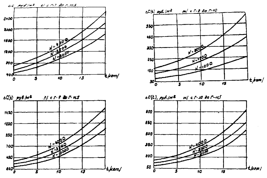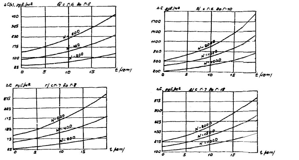 где Kp - капитальные вложения в уширение моста (руб/м2). Графики снижения годовых транспортно-эксплуатационных (удельных) затрат в зависимости от срока службы моста при его уширении (в расчете на 1 м2 уширения)