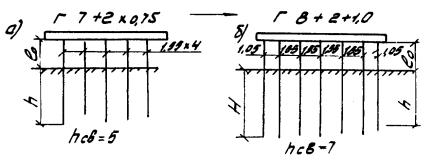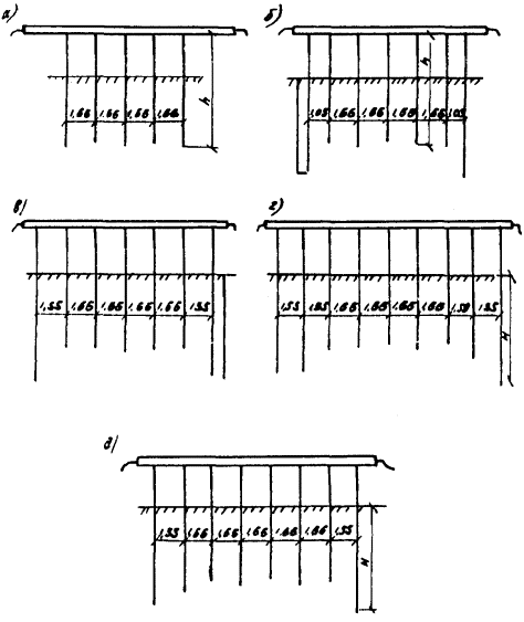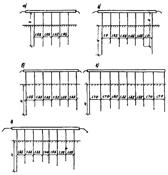 Рис. Д.10. Пролетные строения L =16,76 м. Столбчатые опоры а, б, в - песчаный грунт; г, д, е - глинистый грунт; 1 - прочный; 2 - средний; 3 - слабый Вдоль моста Поперек моста -××- ¾ Г7 + 2´0,75 ® Г8 + 2´1,0 -×××- --- Г7 + 2´0,75 ® Г10 + 2´1,5 -Ñ- -×- Г7 + 2´0,75 ® Г11,5 + 2´1,5 -- -o- Г8 + 2´0,75 ® Г10 + 2´1,5 Е. Береговые опоры Е.1. Рассмотрены существующие свайные двухрядные опоры и козловые, конструкции которых представлены на рисунках Е.1 и Е.2. На рисунках Е.3 и Е.4 приведены схемы этих же опор без забивки (рис. а) и с добивкой (рис. б-д) дополнительных свай. Е.2. Графики, приведенные на рисунках Е.5-Е.7 и Е.8-Е.10 соответственно для свайных и козловых опор с пролетами длиной L по 11,36 м, 14,06 и 16,76 м, позволяют не только установить необходимость уширения свайных опор, но и определить глубину погружения Н новых свай. Е.3. Условие забивки дополнительных свай определяется сопоставлением величины несущей способности свай с учетом упрочнения грунта за период эксплуатации Rτ и N максимального усилия в свае при соответствующем переходе со старого габарита на новый при фактической глубине забивки существующих свай h. Если при этом значение N находится в интервале (0,9-1,1) Rτ, то следует произвести уточняющий расчет. Если N > 1,1 Rτ, то забивки дополнительных свай не требуется, а если N < 0,9 Rτ, то требуется забивка дополнительных свай в соответствии с рис. Е.3 и Е.4 графиками б-д. Длина погружения этих свай определяется по абсциссе точки пересечения линии несущей способности свай без учета упрочнения грунта Р с линией N, соответствующей переходу старого габарита на новый. При этом найденная величина Н должна быть не менее требуемой в соответствии с п. 4.2.3 Рекомендаций. Рис. Е.1. Свайные устои. Вып. 70 Рис. Е.2. Козловые свайные устои. Вып. 143-144 Рис. Е.3. Свайные устои. Вып. 70 а, б - Г7 + 2´0,75 ® Г8 + 2´1,0 в - Г7 + 2´0,75 ® Г10 + 2´1,0 г - Г7 + 2´0,75 ® Г11,5 + 2´1,5 д - Г8 + 2´0,75 ® Г10 + 2´1,5 Рис. Е.4. Свайные устои козлового типа. Вып. 143-144 а, б - Г7 + 2´0,75 ® Г8 + 2´1,0 в - Г7 + 2´0,75 ® Г10 + 2´1,0 г - Г7 + 2´0,75 ® Г11,5 + 2´1,5 д - Г8 + 2´0,75 ® Г10 + 2´1,5 Рис. Е.5. Свайный устой. Вып. 70. L =11,36 м ¾ Г7 + 2´0,75 ® Г8 + 2´1,0 nсв = 5 -- Г7 + 2´0,75 ® Г8 + 2´1,0 nсв = 7 -×- Г7 + 2´0,75 ® Г10 + 2´1,5 -x- Г7 + 2´0,75 ® Г11,5 + 2´1,5 -D- Г8 + 2´0,75 ® Г10 + 2´1,5