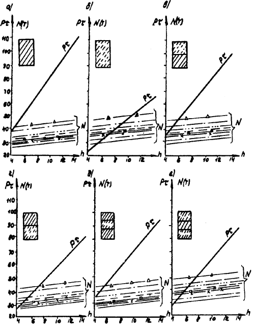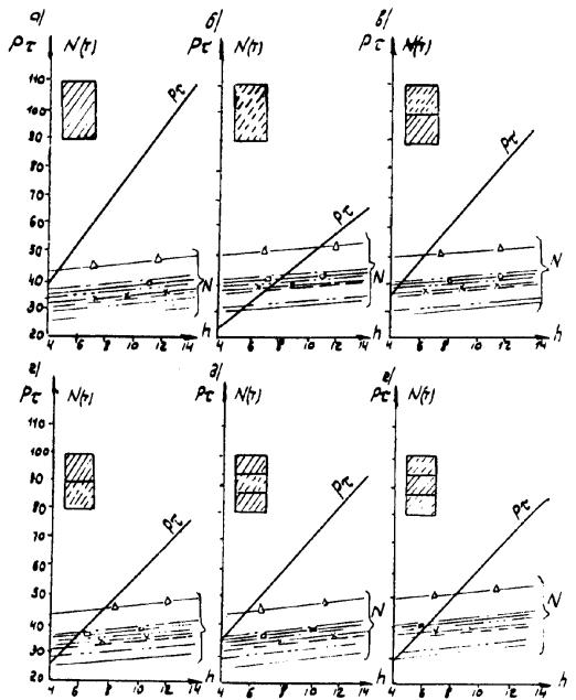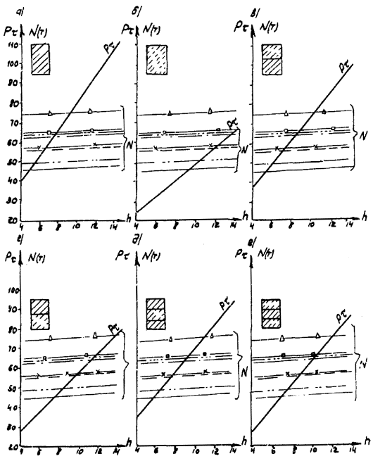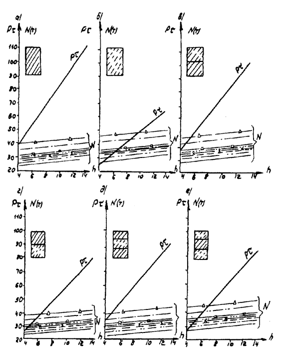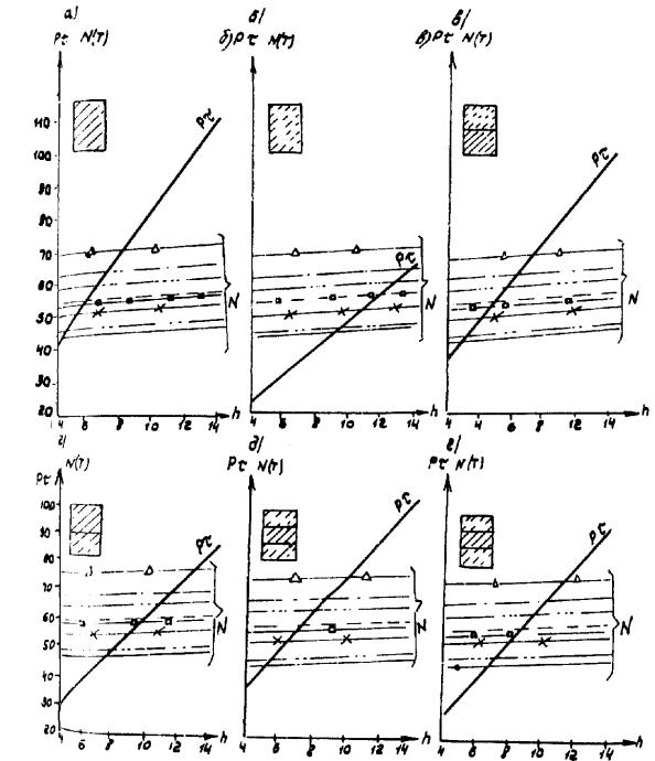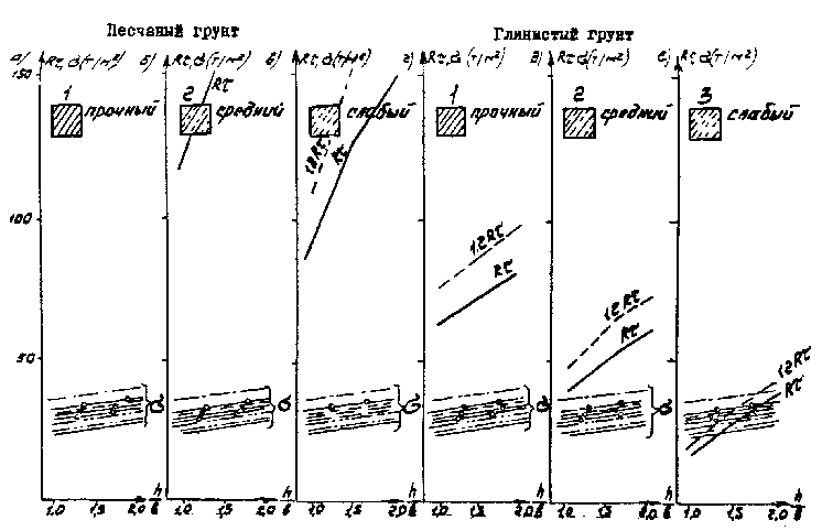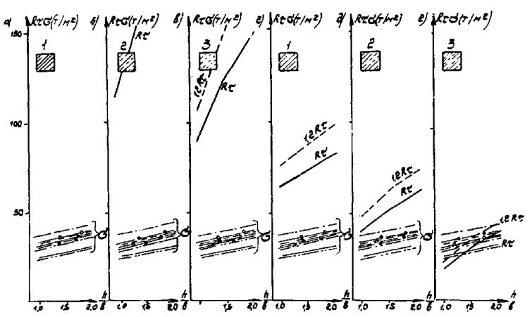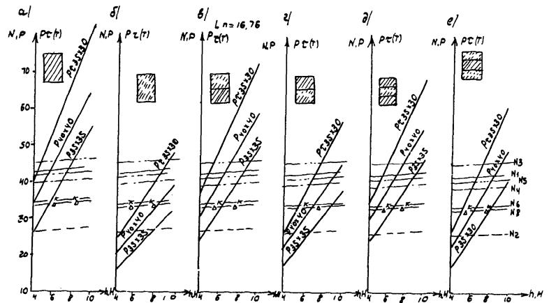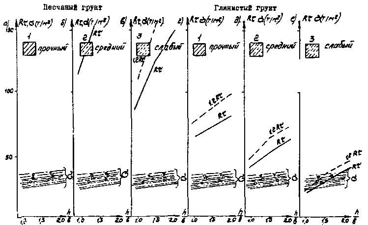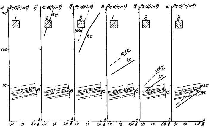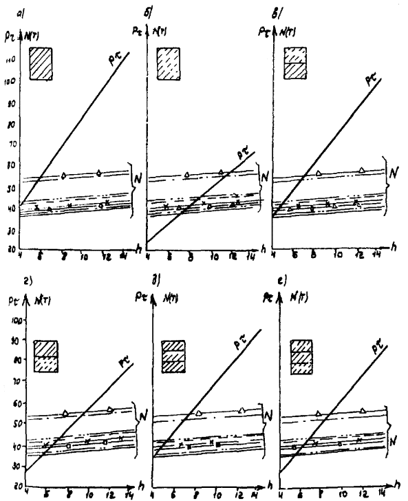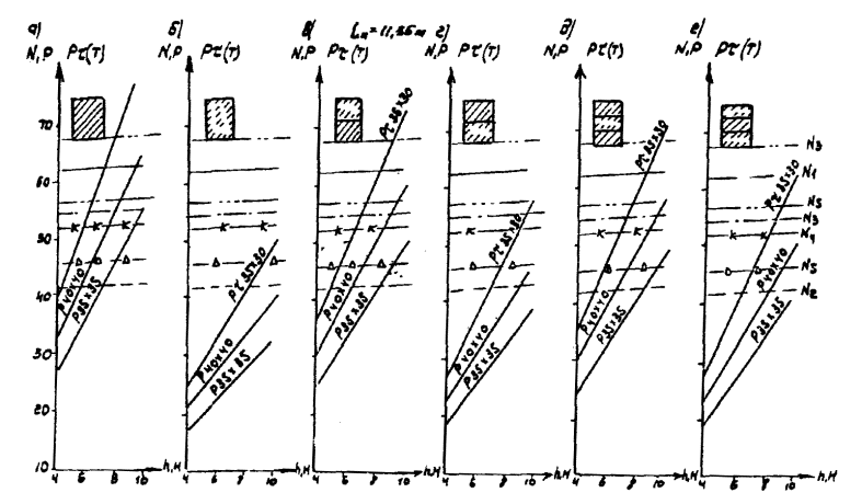 Рис. Д.7. Пролетные строения L =16,76 м. Стоечные опоры а, б, в - песчаный грунт; г, д, е - глинистый грунт; 1 - прочный; 2 - средний; 3 - слабый Вдоль моста Поперек моста -××- ¾ Г7 + 2´0,75 ® Г8 + 2´1,0 -×××- --- Г7 + 2´0,75 ® Г10 + 2´1,5 -Ñ- -×- Г7 + 2´0,75 ® Г11,5 + 2´1,5 -- -o- Г8 + 2´0,75 ® Г10 + 2´1,5