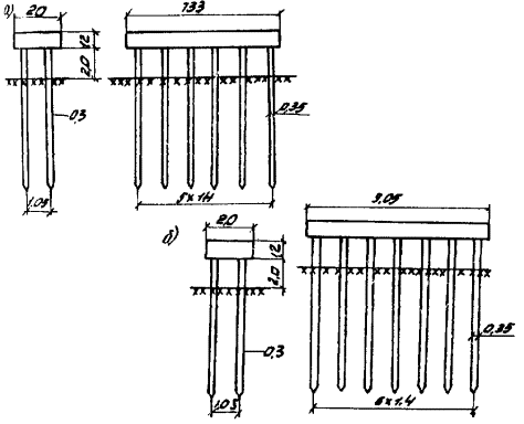 = P2 (1 ± Промежуточные опоры А. Свайные А.1. Рассмотрены опоры эстакадных мостов, схемы которых представлены на рис. А.1. Геометрические характеристики существующих опор под габариты Г-7 + 2 ´ 0,75 м и Г-8 + 2 ´ 0,75 м приведены на рис. А.2. А.2. На рис. А.3 приведены возможные варианты уширения опор без добивки (а) и с добивкой (б) дополнительных свай. А.3. Графики, приведенные на рисунках А.4, А.5 и А.6 соответственно для сопрягающихся пролетов по 11,36; 14,06 и 16,76 м, позволяют не только установить наличие или отсутствие необходимости уширения свайных опор, но и определить необходимую глубину погружения «Н» вновь забиваемых свай в случае такой необходимости. А.4. На указанных графиках приведены линии Ni - максимальных расчетных усилий, приходящихся на голову свай (с учетом их веса) при уширении мостов со старого габарита на новый, и линии Pt и Р для различного сочетания грунтов, в которые погружена свая. Нечетные значения индексам i при N приданы для случаев, когда опора уширяется без добивки свай (схемы «а» на рис. А.3), а четные - при забивке дополнительных свай (схемы «б» на рис. А.3). Pt - расчетная несущая способность существующих свай сечением 30 ´ 35 см и с учетом уплотнения грунта за счет длительной эксплуатации (при условии, если не добиваются новые сваи); P - расчетная несущая способность свай сечением 35 ´ 35 и 40 ´ 40 см без учета уплотнения грунта (принимается для вновь забиваемых свай). А.5. Абсцисса - точка пересечения линий Ni (при i - нечетных) и Pt - показывает минимально необходимую глубину погружения в грунте старой сваи - h, при которой не требуется забивки дополнительных свай. Если фактическая глубина hф погружения существующих свай в конкретно рассматриваемом случае окажется hф < h, то требуется добивка свай. В этом случае по абсциссам точек пересечения линии Ni (при i - четных) и линий Р определяют ту глубину H, на которую необходимо забить новые сваи сечением 35 ´ 35 см или 40 ´ 40 см, чтобы их несущая способность по грунту Р была бы более Ni, однако эта глубина Н должна быть не менее требуемой в соответствии с п. 4.2.3 Рекомендаций. Рис. А-1 Рис. А-2 Рис. А-3 (начало)