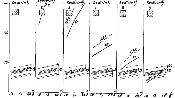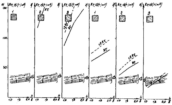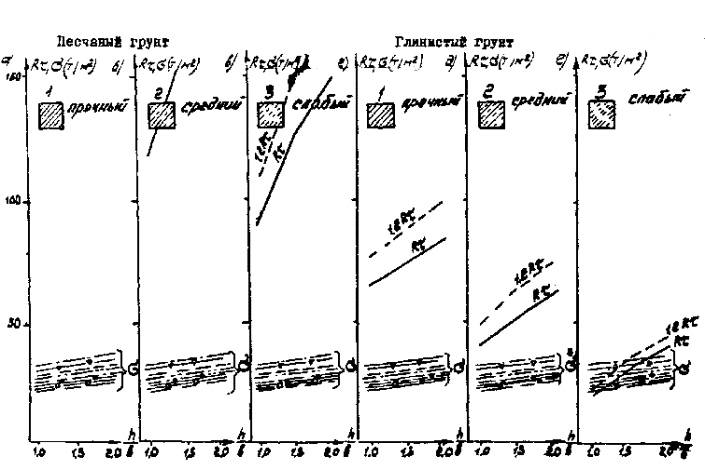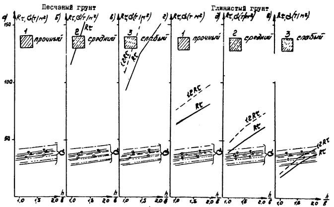 Рис. Г.5. Стоечная опора с облицовкой L = 14,06 м Вдоль моста Поперек моста - Г7 + 2´0,75 ® Г8 + 2´1,0; -××- Г7 + 2´0,75 ® Г8 + 2´1,0 -- Г7 + 2´0,75 ® Г10 + 2´1,5; -×××- Г7 + 2´0,75 ® Г10 + 2´1,5 -×- Г7 + 2´0,75 ® Г11,5 + 2´1,5; -D- Г7 + 2´0,75 ® Г11,5 + 2´1,5 -x- Г8 + 2´1,0 ® Г10 + 2´1,5; -- Г8 + 2´1,0 ® Г10 + 2´1,5 Рис. Г.6. Стоечная опора с облицовкой L = 16,76 м Вдоль моста Поперек моста - Г7 + 2´0,75 ® Г8 + 2´1,0; -××- Г7 + 2´0,75 ® Г8 + 2´1,0 -- Г7 + 2´0,75 ® Г10 + 2´1,5; -×××- Г7 + 2´0,75 ® Г10 + 2´1,5 -×- Г7 + 2´0,75 ® Г11,5 + 2´1,5; -D- Г7 + 2´0,75 ® Г11,5 + 2´1,5 -x- Г8 + 2´1,0 ® Г10 + 2´1,5; -- Г8 + 2´1,0 ® Г10 + 2´1,5 Д. Опоры на фундаментах мелкого заложения Д.1. Рассмотрены фундаменты под опоры-стенки, стоечные и двухстолбчатые опоры, размеры которых приведены на рис. Д.1. Д.2. Расчет фундаментов произведен при относительной величине заглубления подошвы фундамента h/b = 1 - 2. Д.3. На рисунках Д.2-Д.4 приведены графики для опор-стенок; на рисунках Д.3-Д.7 - для стоечных опор с облицовкой; на рисунках Д.8-Д.10 - для одностолбчатых опор; в каждом случае они даны для сопрягающихся пролетов Ln = 11,36 м; Ln = 14,06 м и Ln = 16,76 м при наивыгоднейшем загружении как вдоль, так и поперек моста. Д.4. На графиках приведены линии расчетного сопротивления Rτ (сплошные линии) и 1,2 Rτ - (пунктирные линии) различных грунтов, лежащих в основании фундамента, с учетом их упрочнения во времени, а также линии максимальных краевых напряжений σ в зависимости от относительной величины заглубления подошвы фундамента h/b. В соответствии с соотношением напряжений, возникающих по подошве фундамента от изгибающего момента и от нормальных сил, величины σ, вычисленные при расчете вдоль, должны сопоставляться с Rτ, а вычисленные при расчете поперек моста - с величинами 1,2 Rτ, при этом для опор, указанных в п. Д.3, запас должен приниматься из учета D = 12 %. Д.5. Графиками Д.5-Д.10 можно воспользоваться для стоечных опор без облицовки и двухстолбчатых опор, для которых кривые напряжения на 10-12 % меньше, чем для опор с облицовкой и одностолбчатых, в связи с чем величины σ для них на указанных графиках являются соответственно завышенными, что позволяет непосредственно сопоставлять σ и Rτ (1,2 Rτ) без введения запаса. Рис. Д.1. Опоры на фундаментах мелкого заложения