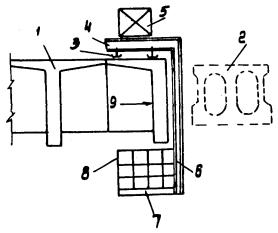 2. Положение люльки для свержения и работы под пролетом: 1 - существующая балка; 2 - приставляемая плита; 3 - направляющие люльки; 4 - рама люльки; 5 - пригруз; 6 - подвеска; 7 - днище; 8 - перила; 9 - направление сверления