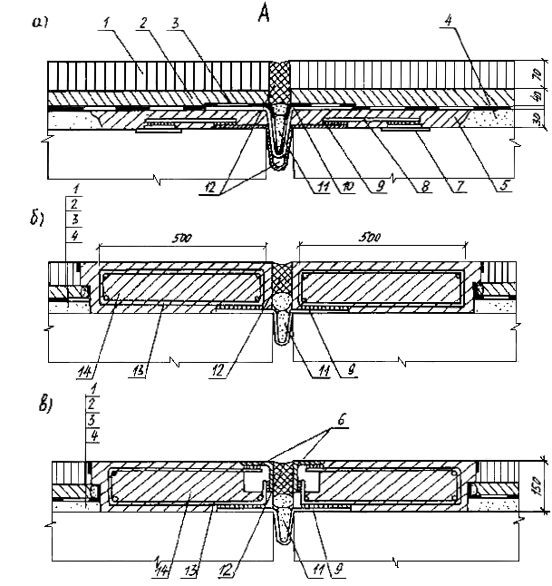 Рис. 2. Конструкции деформационных швов заполненного типа А - в асфальтобетонном покрытии: а - с асфальтобетонными кромками; б - бетонным приливом; в - металлическим окаймлением; 1 - асфальтобетонное покрытие; 2 - защитный слой; 3 - гидроизоляция; 4 - существующий выравнивающий слой; 5 - новый выравнивающий слой (бетон или полимербетон); 6 - металлическое окаймление; 7 - закладная деталь в балках; 8 - стальная накладка толщиной 10 мм (шаг £600); 9 - металлический компенсатор; 10 - неметаллический компенсатор; 11 - пористый заполнитель плиты; 12 - каркас бетонного прилива; 14 - бетонный прилив Б - в цементобетонных покрытиях: а - с оклеечной гидроизоляцией; б - без оклеечной гидроизоляции и с металлическим окаймлением; 1 - цементобетонное покрытие; 2 - гидроизоляция; 3 - выравнивающий слой; 4 - мастика заполнения; 5 - анкерный стержень; 6 - компенсатор; 7 - пористый заполнитель; 8 - металлическое окаймление; 9 - арматурный каркас; 10 - вертикальные анкера 2.2. Деформационные швы закрытого типа содержат: металлический (или неметаллический) компенсатор, закрепленный на концах пролетных строений и предназначенный для удержания заполнения; гидроизоляционный слой, дополненный полиэтиленовой пленкой, стабилизированной сажей и заведенный в петлю компенсатора; пористое заполнение петли компенсатора; уплотнитель зазора в уровне защитного слоя из пенопласта или дерева, предназначенный для предотвращения вдавливания покрытия в зазор; армированное или неармированное асфальтобетонное покрытие, уложенное без разрыва. Металлический компенсатор вырезают из латунного листа или оцинкованного железа толщиной 1,0-1,2 мм и придают ему форму лотка, В пролетном строении компенсатор закрепляют с помощью горизонтальных анкерных полос, соединяемых с продольной арматурой (рис. 3а). Неметаллический компенсатор состоит из двух слоев гидростеклоизола, склеенных между собой мастикой и приклеенных к выравнивающему слою (рис. 3б). Допускается оставлять в деформационном шве металлические компенсаторы иной формы и размеров, если они находятся в удовлетворительном состоянии. При этом дополнительно устраивают неметаллический компенсатор. Уплотнитель, применяемый в швах закрытого типа (см. рис. 1), может быть выполнен из доски повышенной влажности или пенопласта. Одновременно он является опалубкой для выравнивающего слоя (рис. 4). 2.3. Деформационные швы заполненного типа содержат: металлический компенсатор предназначен для удержания заполнения, состоит из гнутой тонколистовой стали толщиной 2-2,5мм, закрепляется с помощью накладок (с шагом не более 0,6 м), приваренных к закладным деталям, либо оголенной арматурой; неметаллический компенсатор (см. рис. 3б и п. 2.2) расположен по верху металлического, служит для отвода воды из шва и закрыт сверху слоем гидроизоляции; пористое заполнение петли компенсатора уменьшает расход мастики; заполнение в виде мастики или пасты в уровне защитного слоя и покрытия (либо в уровне только асфальтобетонного покрытия, если его толщина превышает 5 см) обеспечивает герметичность шва; металлическое окаймление шва применяют для защиты кромок бетонного прилива в пролетных строениях на дорогах (I и II категории) с большой интенсивностью движения автомобилей. Рис. 3. Металлические (а) и неметаллический (б) компенсаторы деформационных швов: 1 - лотковая часть компенсатора; 2 - по