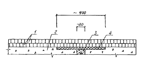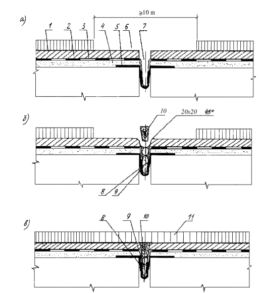 типа: б - заполнение зазора, заклинивание уплотнителя; в - укладка покрытия; 1 - асфальтобетонное покрытие; 2 - защитный слой; 3 - гидроизоляция; 4 - выравнивающий слой; 5 - компенсатор; 6 - вырубленное покрытие; 7 - очищенный зазор; 8 - мастика; 9 - пористый заполнитель; 10 - уплотнитель; 11 - новое покрытие При замене асфальтобетона в швах с армированным покрытием вырубку делают шириной, превышающей на 0,5 м ширину армирования. На зазор в уровне защитного слоя укладывают отделяющую прокладку из двух слоев рубероида или промасленной бумаги, которую располагают без стыков по всей длине ремонтируемого участка шва. Ширина прокладки должна составлять 500-800 мм при толщине покрытия соответственно 70-100 мм. На оставшийся участок защитного слоя и поверхность отделяющей прокладки разливают эмульсию (или вяжущее) и приклеивают к ней армирующую сетку, раскатывая вдоль моста (начало от тротуара) с перехлестом 5 см (рис. 9). Края сетки пригружают валиком асфальтобетонной смеси. В вырубку устанавливают ограничительную доску толщиной 40-50 мм и фиксируют ее с помощью упоров, затем на слой армирующей сетки укладывают нижний слой асфальтобетонного покрытия, располагают его по длине шва, превышающей половину габарита проезжей части. По свежему слою покрытия раскатывают второй слой армирующей сетки, переставляют ограничительную доску и укладывают верхний слой покрытия. Работы на второй половине шва повторяют. Рис. 9. Схема укладки армирующей сетки при замене покрытия в швах закрытого типа с армированным асфальтобетоном: 1 - ограничительная доска; 2 - нижний слой армирующей сетки; 3 - уплотнитель зазора в уровне защитного слоя; 4 - отделяющая прокладка; 5 - граница вырубки асфальтобетона; 6 - ограждающие конусы; 7 - упоры; 8 - существующее покрытие; 9 - тротуар; 10 - верхний слой армирующей сетки; 11 - ось расположения ограничительной доски при укладке верхнего слоя покрытия. При разрушении защитного слоя более чем на 10 см от кромки шва ремонт выполняют с использованием цементобетонной смеси по цементно-песчаному раствору. В случае обнаружения повреждения защитного слоя на значительной площади у шва дефектный бетон удаляют, разравнивают выпуски арматуры, восстанавливают гидроизоляционный слой и бетон защитного слоя. При этом из слоя битумной мастики извлекают щебенку и обломки бетона и наклеивают один слой изоляционного рулонного материала (например гидростеклоизола) без разрыва и с опусканием в петлю компенсатора. Поверх рулонного Материала разливают слой горячей мастики, вдоль шва раскатывают полиэтиленовую пленку и заводят ее в петлю, прижимая к стенкам и горизонтальным поверхностям, на которые нанесена мастика. Сверху посыпают цементом, прикатывают ручным катком, укладывают армирующую сетку защитного слоя и бетонируют защитный слой. Поверхность защитного слоя, подверженного разрушению (шелушению) на глубину до 2 см, ремонтируют также полимербетоном или эпоксидно-минеральной смесью (составы которой приведены в разд. 4). Поверхность предварительно очищают, а затем эпоксидно-минеральную смесь распределяют тонким слоем и присыпают песком из расчета 1 кг/м2. Уплотнение смеси производят катками весом 3-5 т за два прохода или виброплощадкой. Асфальтобетонное покрытие укладывают на защитный слой спустя 5 сут после ремонта смесью на обычном цементе, 1 сут - смесью БТЦ, 12 ч - 