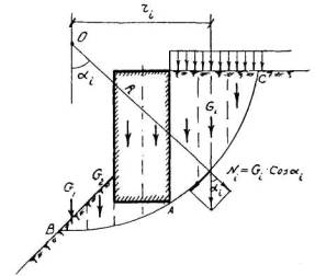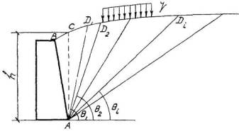 где Gi - сумма веса Gгр предполагаемой призмы обрушения ACDi и равнодействующей расположенной на ней нагрузки (рис. 7);