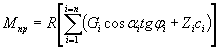 где G-сила, равная сумме веса i-й части сползающего массива, заключенной между вертикальными плоскостями, и равнодействующей расположенной на ней нагрузки (см. рис. 3); для тех частей сползающего массива, в пределах которых расположена подпорная стена, сила G определяется с учетом ее веса; ri- плечо силы Gi относительно точки О; момент Gi, ri положителен, когда его направление совпадает с направлением скольжения;