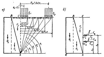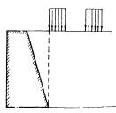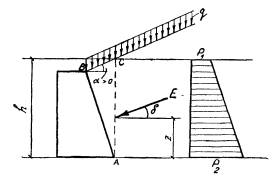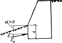 Рис. 8 В формулах (25) и (26) х - расстояние между задней гранью стены и осью полосы (шириной а) нагрузки, a ho- разность отметок уровня поверхности грунта под центром полосы шириной а и точкой С (см. рис. 8). В случае автодорожной нагрузки на призме обрушения силу Е следует определять [по формуле (21)] исходя из того, что плоскость обрушения на поверхность грунта должна выходить слева или справа от полосы колесной нагрузки, не деля ее на две части. Если часть полосы железнодорожной нагрузки оказывается за пределами призмы обрушения, под размером а следует понимать ширину той части полосы, которая расположена на призме обрушения. 5.3. Если задняя грань ВС стены имеет наклон в сторону насыпи