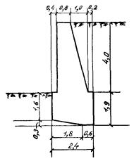 грунта объемный вес грунта равен 1,8 т/м3; расчетное сопротивление грунтового основания осевому сжатию R=3,5 кг/см2; коэффициент трения кладки о грунт основания ¦=0,4; марка бетона стены-150. На призме обрушения нагрузка НК-80.