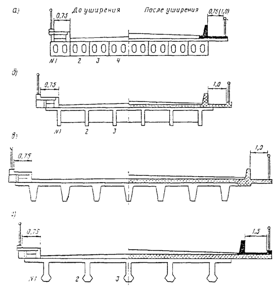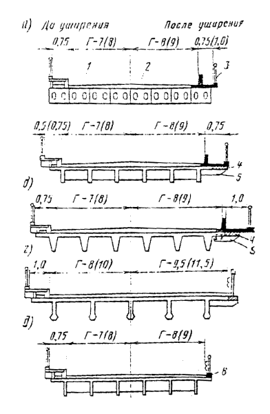 3.12. При выборе схем уширения пролетных строений учитывают тот факт, что при значительных уширениях (более 2 м в одну сторону) появляется опасность занижения высоты подмостового габарита. Для подобных. сооружений следует рассматривать лишь такие схемы уширения, в которых при поперечном уклоне 2% отметка низа добавляемых конструкций соответствует требованиям п. 1.23 СНиП 2.05.03-84. Целесообразно использовать накладную плиту, дополнительные балки пониженной высоты (проект 856) и пустотные плиты. Рис. 3.7. Схемы комбинированных методов уширения сборных диафрагменных пролетных строений Рис. 3.8. Схемы комбинированных методов уширения сборных бездиафрагменных (а-б) и монолитных диафрагменных (в, г) пролетных строений Таблица 3.4